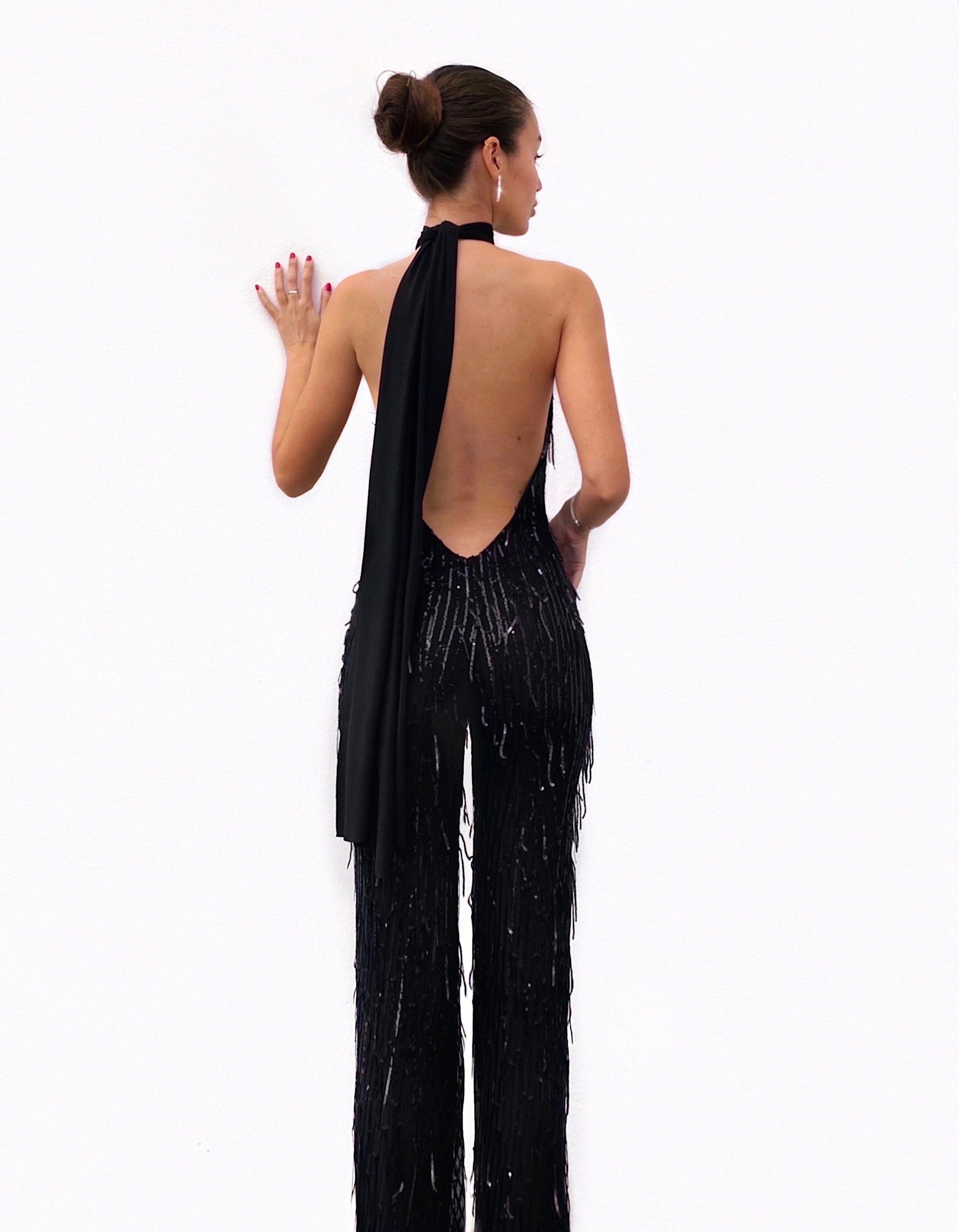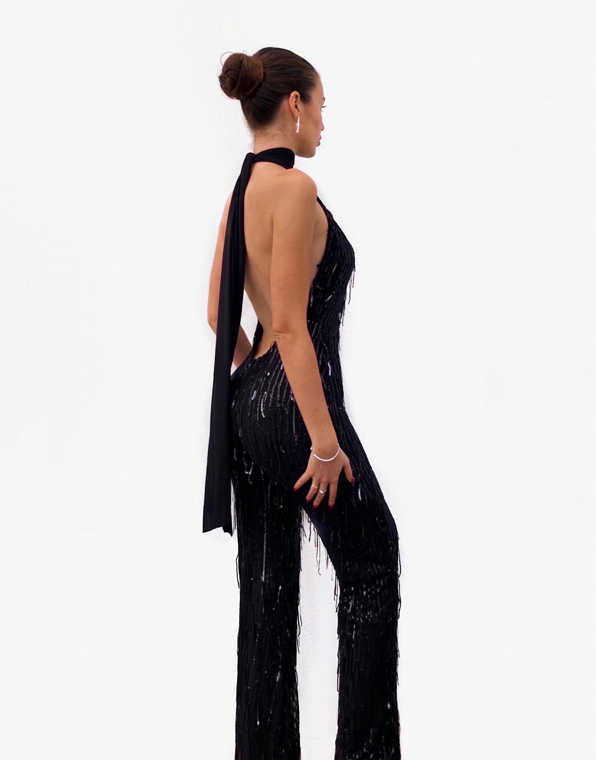 Mono largo de tejido lentejuelas y de color negro muy ajustado al cuerpo. Lleva cuello halter muy favorecedor y flecos por todo el cuerpo y lazo con caída. La espalda es brutal, totalmente descubierta dándole un toque muy sensual. Es elástico. Ideal para Navidad, ocio nocturno, fiestas, eventos...