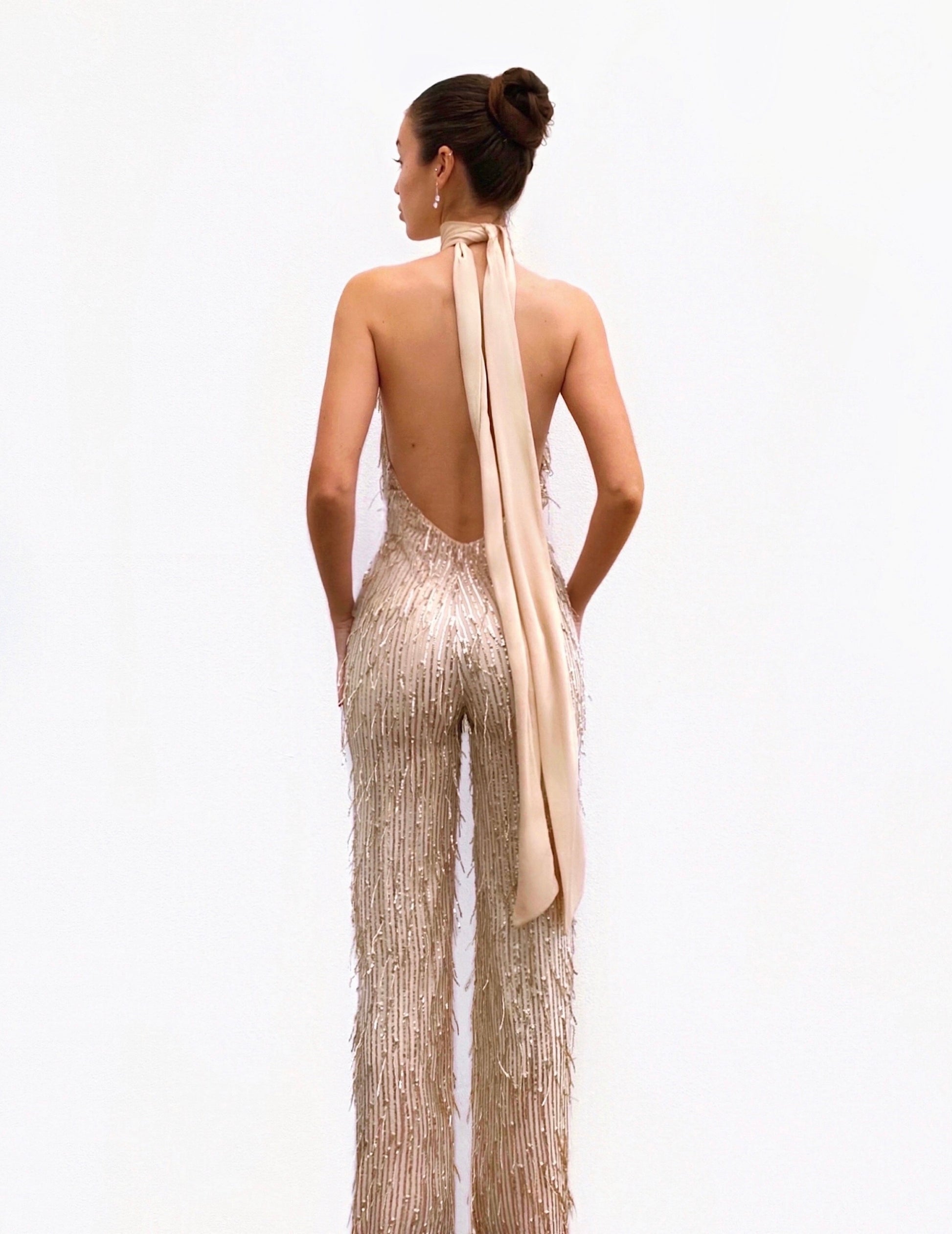 Mono largo de tejido lentejuelas y de color champagne muy ajustado al cuerpo. Lleva cuello halter muy favorecedor y flecos por todo el cuerpo y lazo con caída. La espalda es brutal, totalmente descubierta dándole un toque muy sensual. Es elástico. Ideal para Navidad, ocio nocturno, fiestas, eventos...
