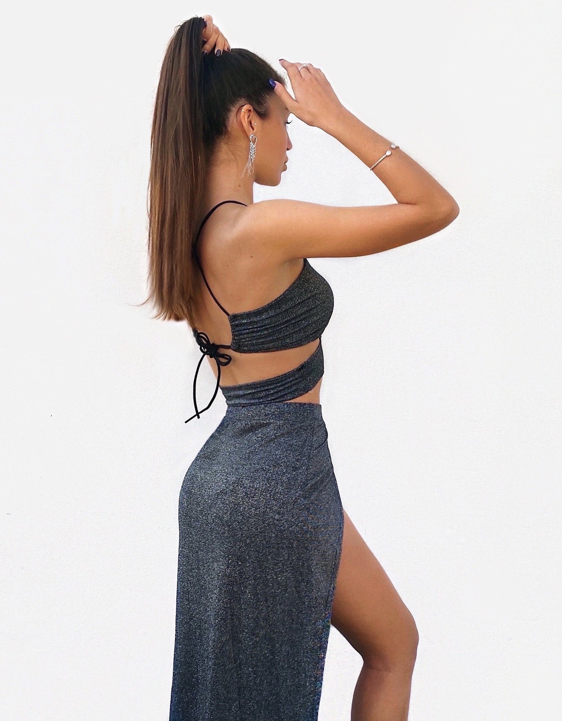 Conjunto de dos piezas, top y falda de tejido lurex. El top lleva cuello halter y espalda al aire ajustable con lazo. La falda tiene detalle de abertura lateral discreto que deja la pierna al descubierto. Además lleva goma elástica en la cintura para adaptarse perfectamente al cuerpo. Ideal para Navidad, bodas, graduaciones, eventos, fiestas, aniversarios…