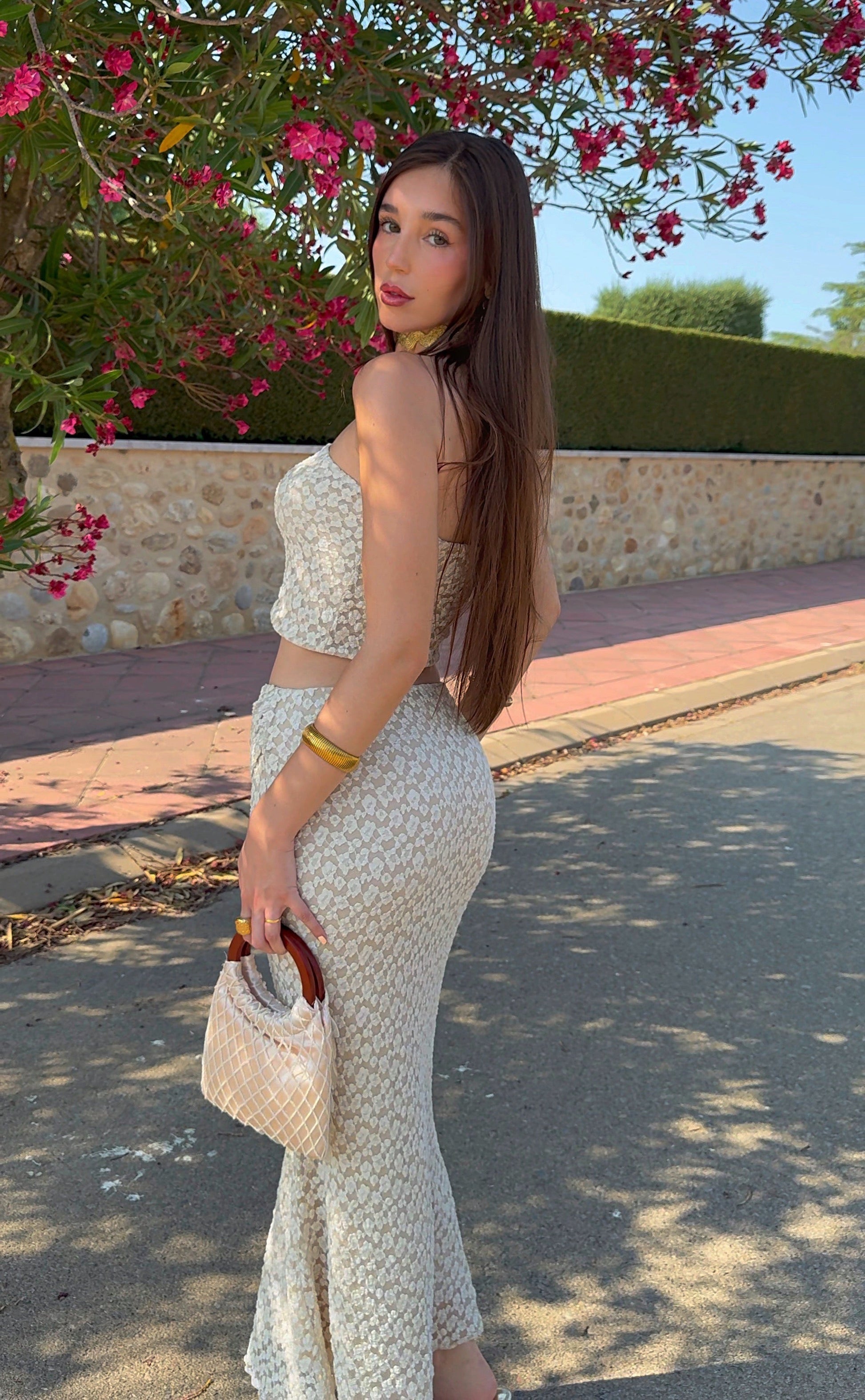 Conjunto blanco de top y falda con tejido de encaje bordado de flores. El top lleva escote palabra de honor y la falda forro. Ambas prendas llevan goma elástica para adaptarse perfectamente al cuerpo. Ideal para días y noches de verano, cocktails, etc.