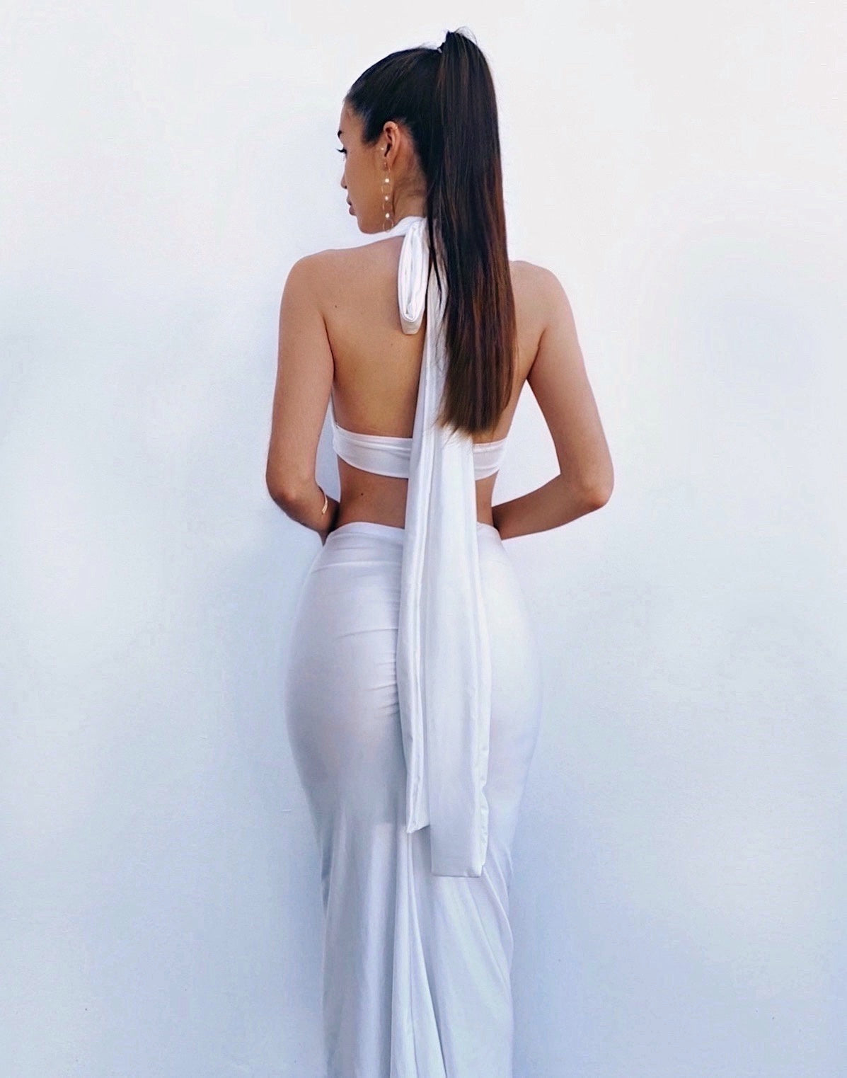 Conjunto de dos piezas blancas de tejido satinado, top y falda larga. El top es multi posición, lleva escote en pico y abertura en la parte trasera. La falda es ajustada con goma en la cintura y fruncida por detrás con forma V. Elástico. Ideal para los días y las noches de verano, cenas elegantes...