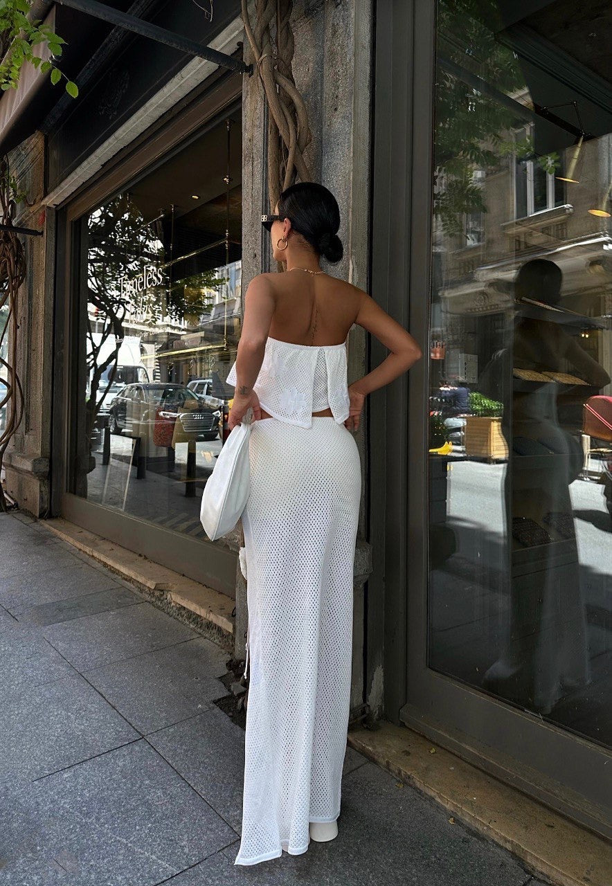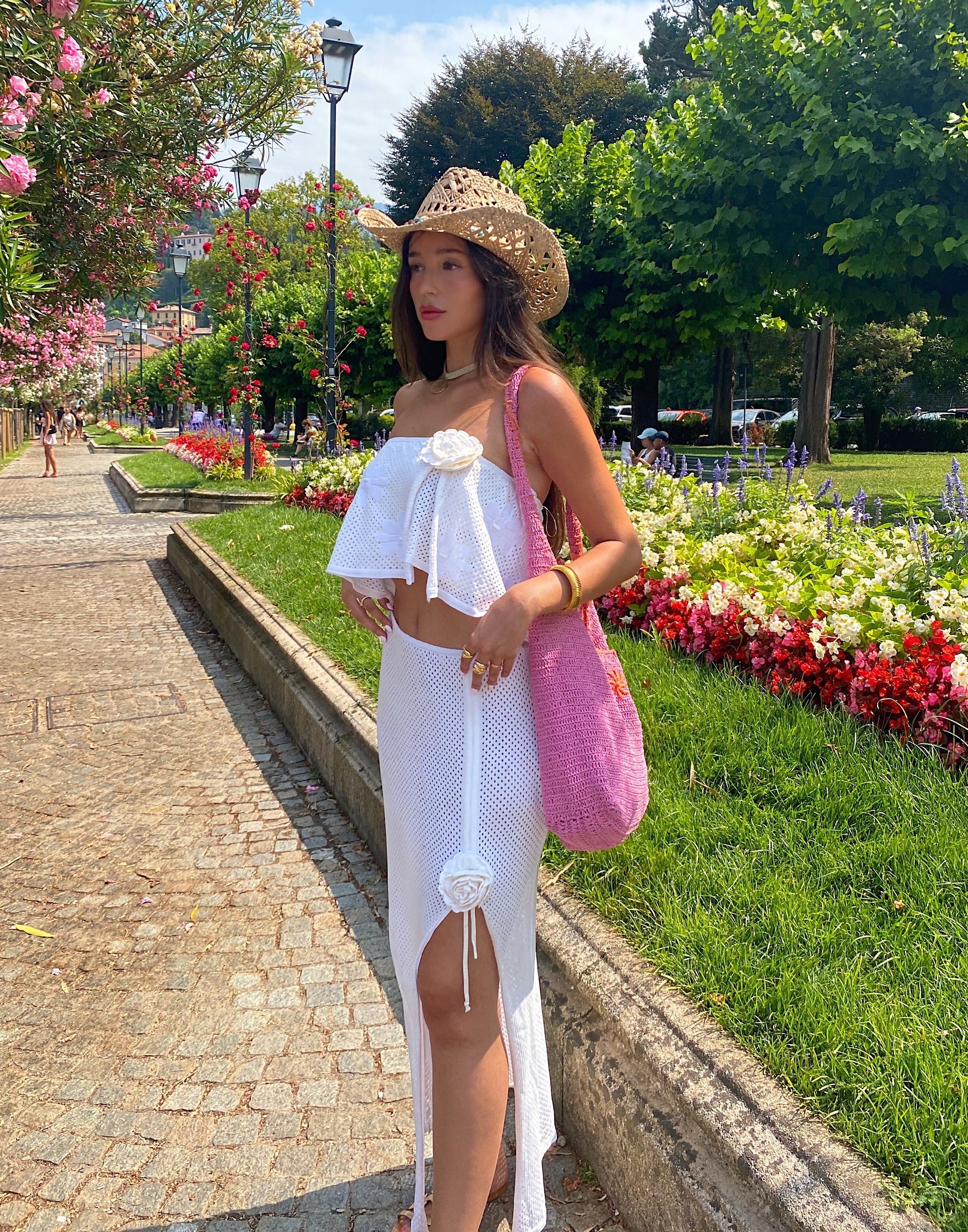Conjunto blanco de top y falda larga, llevan detalle de flor y goma elástica para adaptarse genial al cuerpo. La falda lleva abertura en un lateral de la pierna. Ideal para días y noches de verano, cocktails, etc.