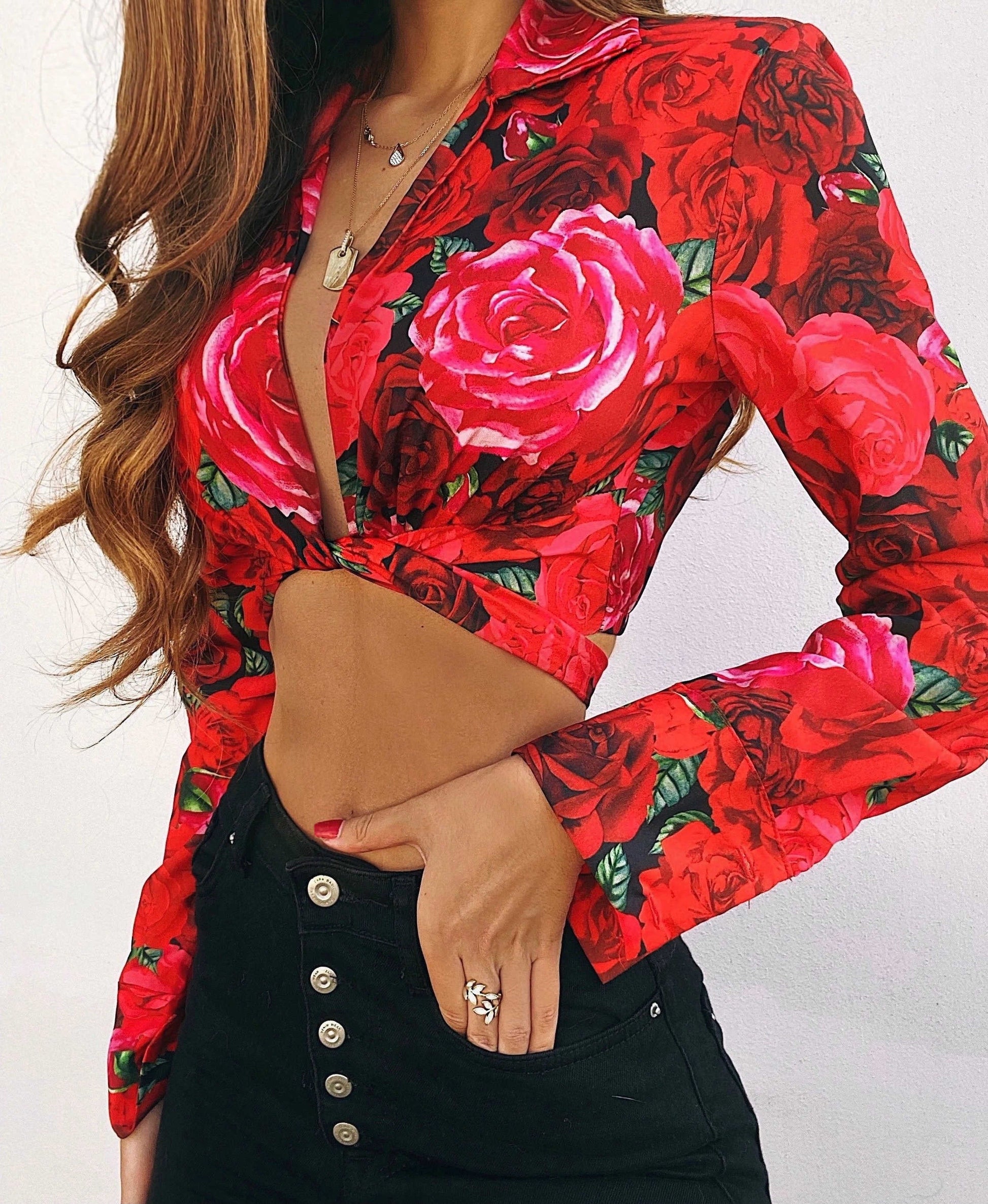 Precioso top con estampado de flores rojas, lleva hombreras y se puede anudar por delante o por detrás. Lleva goma elástica detrás para adaptarse bien al cuerpo. Se puede ajustar a tu medida ideal, poniéndolo más o menos abierto.
