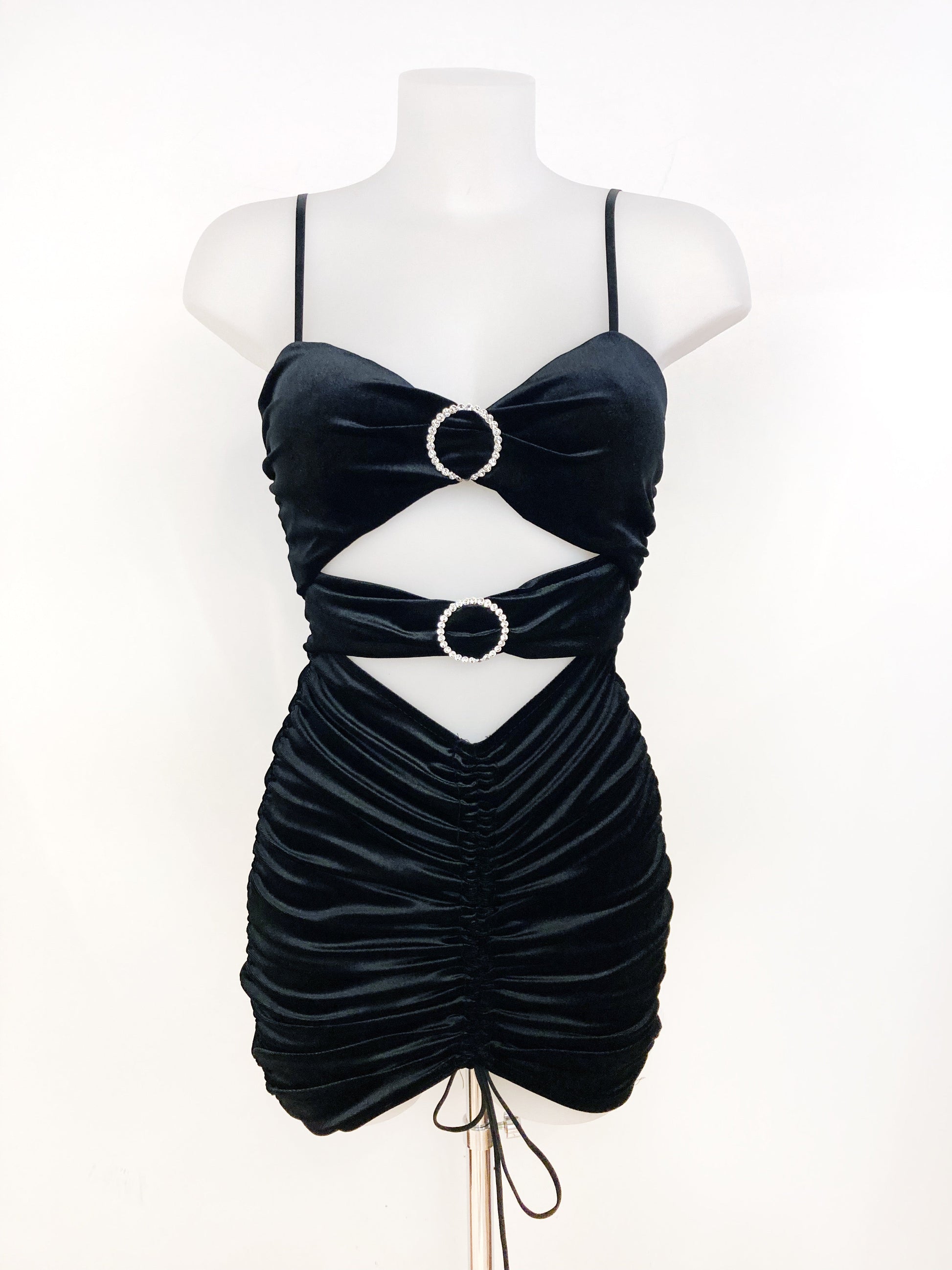 Vestido color negro corto y muy ajustado al cuerpo. Es de terciopelo, lleva copas que se ajustan bien al pecho, tirantes regulables y todo el cuerpo fruncido, para poder adaptar el largo a tu medida ideal. Tiene aberturas y detalle de brillantes que le dan un toque muy elegante y sensual.