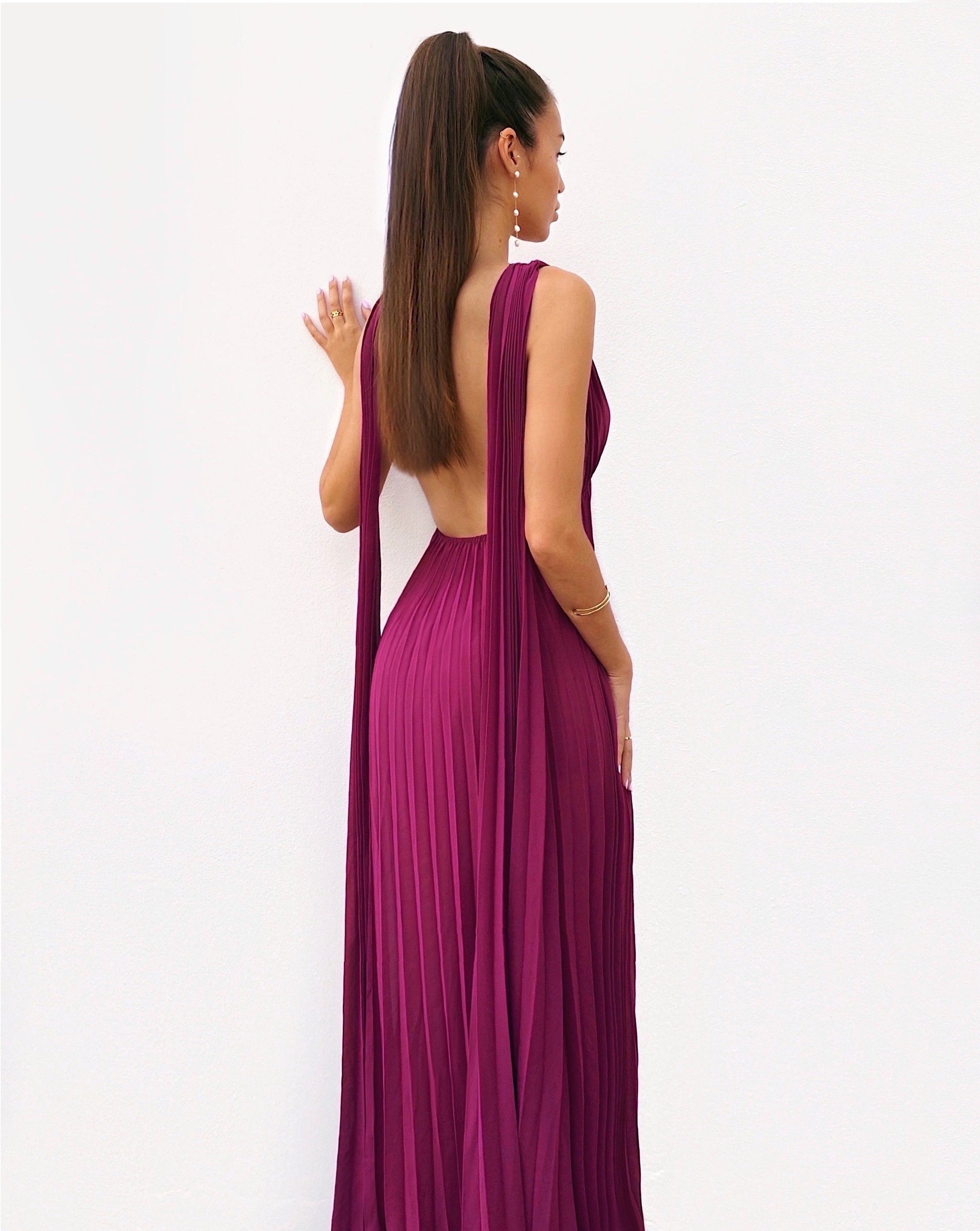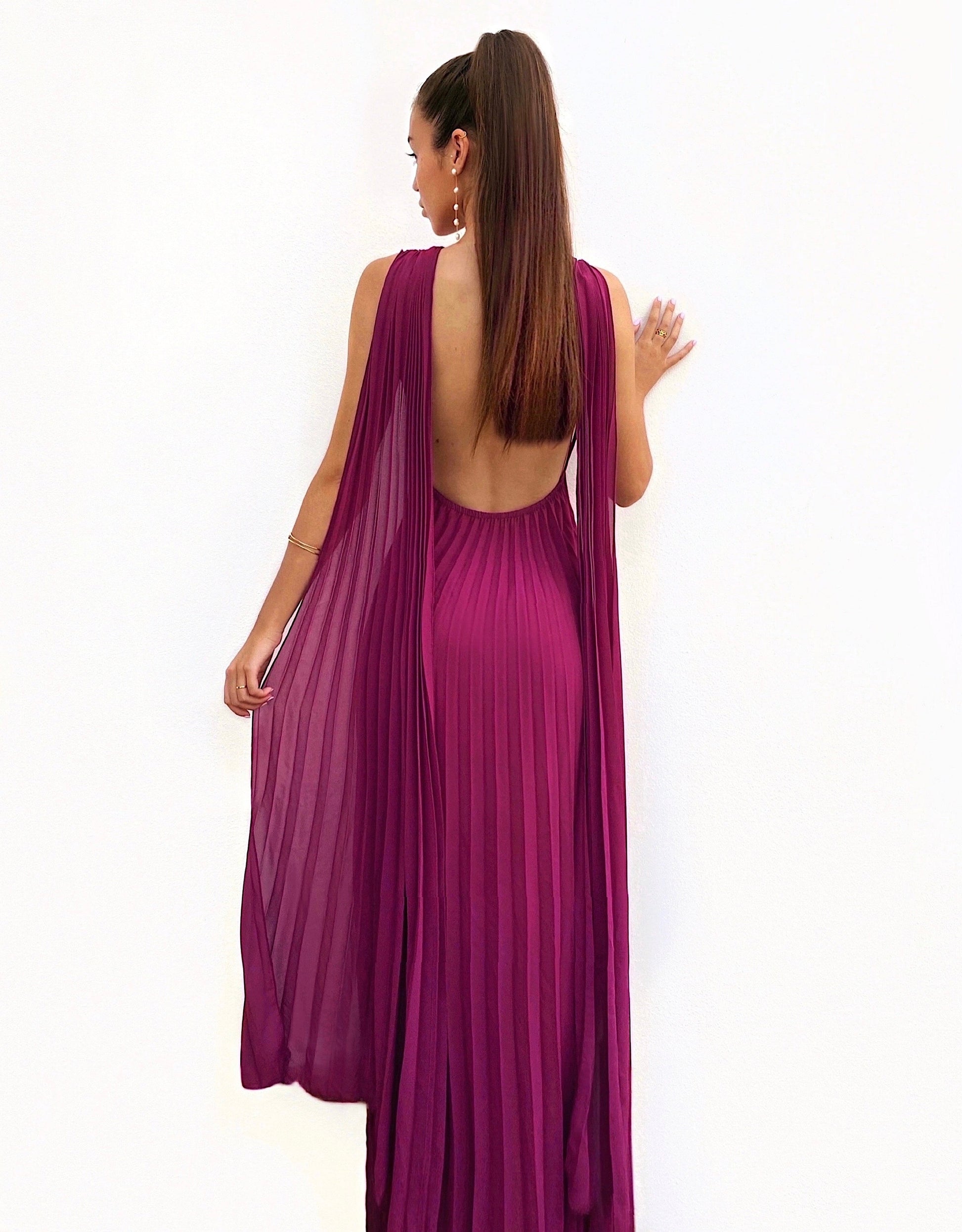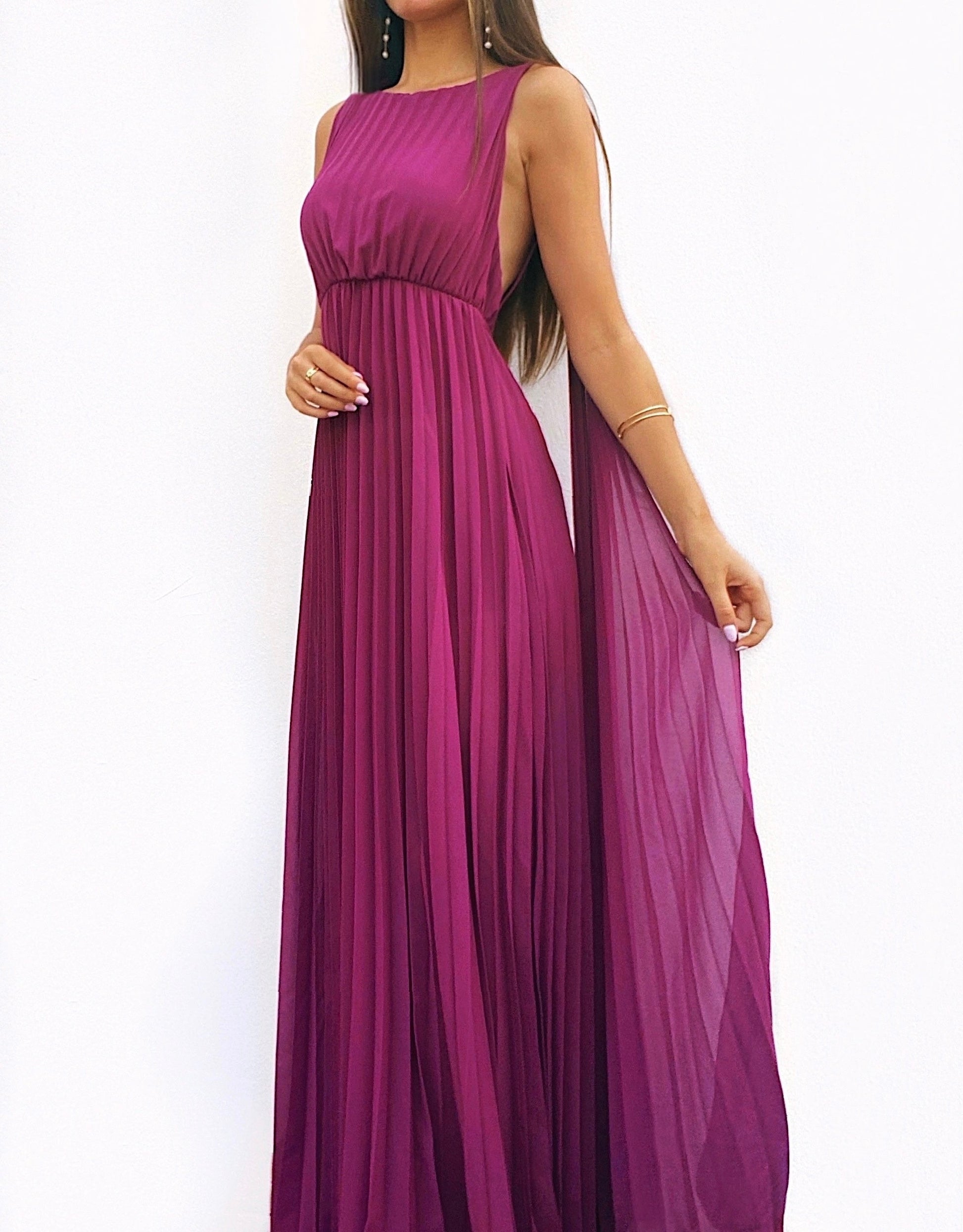 Vestido largo de gasa plisada de color amarena. Lleva capas en los hombros muy elegantes y espalda totalmente al aire. Tiene cinturilla elástica para adaptarse perfectamente al cuerpo.