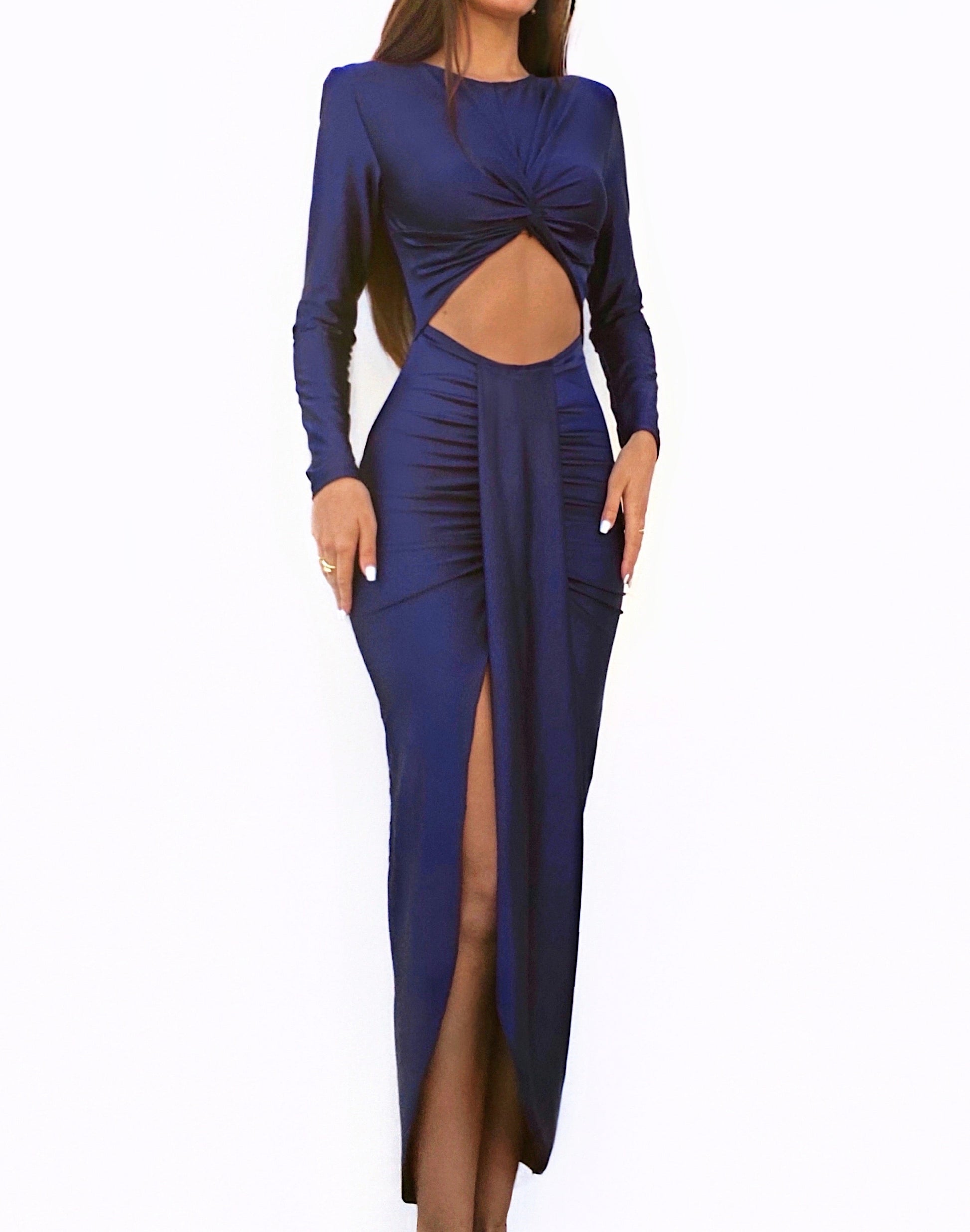 Vestido largo de manga larga, color azul marino y de tejido satinado muy ajustado al cuerpo. Lleva abertura central, copas en el pecho, detalle de nudo, hombreras y abertura en un lateral de la pierna. Es elástico, se adapta al cuerpo. Ideal para bodas, graduaciones, eventos, fiestas...