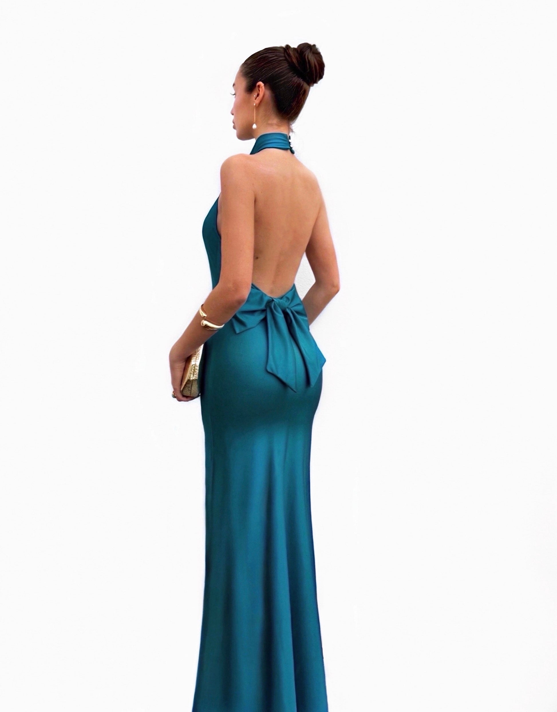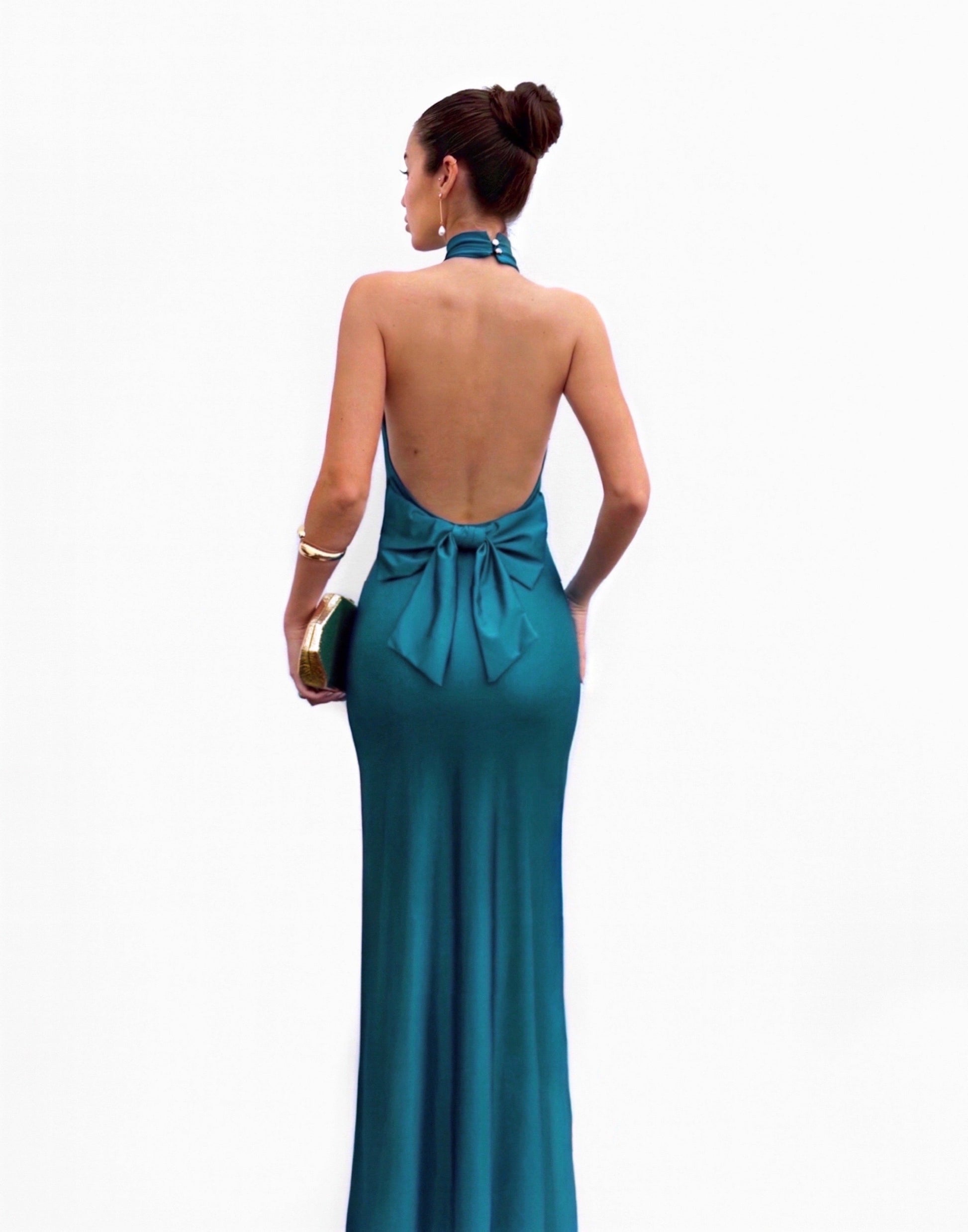 Vestido largo de tejido satinado y de color azul petróleo muy ajustado al cuerpo. Es un vestido muy elegante y sensual a la vez. Lleva cuello alto con frunce y espalda totalmente descubierta con detalle de lazo. Cierre con botones al cuello. Es muy elástico y cómodo, se adapta genial al cuerpo. Modelo de fabricación propia. Ideal para graduaciones, bodas, eventos...