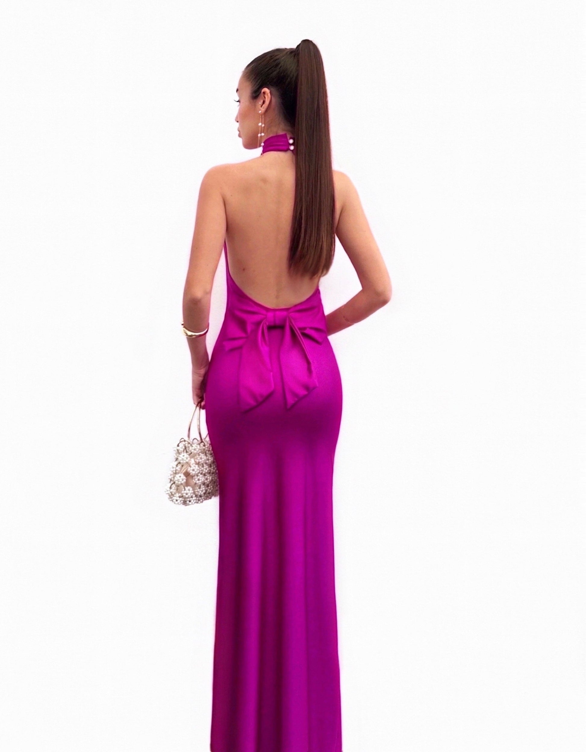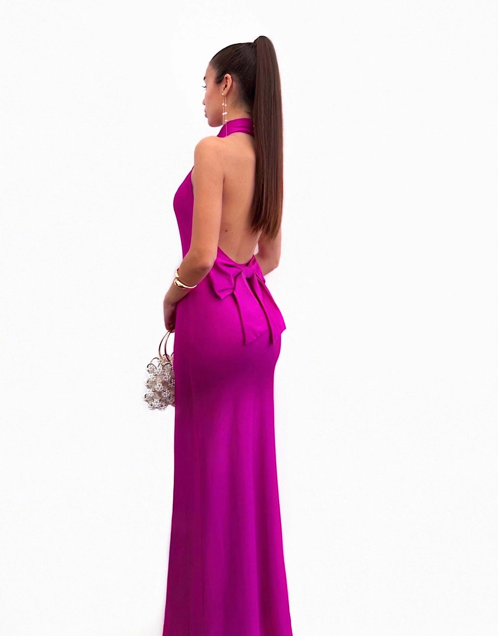 Vestido largo de tejido satinado y de color buganvilla muy ajustado al cuerpo. Es un vestido muy elegante y sensual a la vez. Lleva cuello alto con frunce y espalda totalmente descubierta con detalle de lazo. Cierre con botones al cuello. Es muy elástico y cómodo, se adapta genial al cuerpo. Modelo de fabricación propia. Ideal para graduaciones, bodas, eventos...