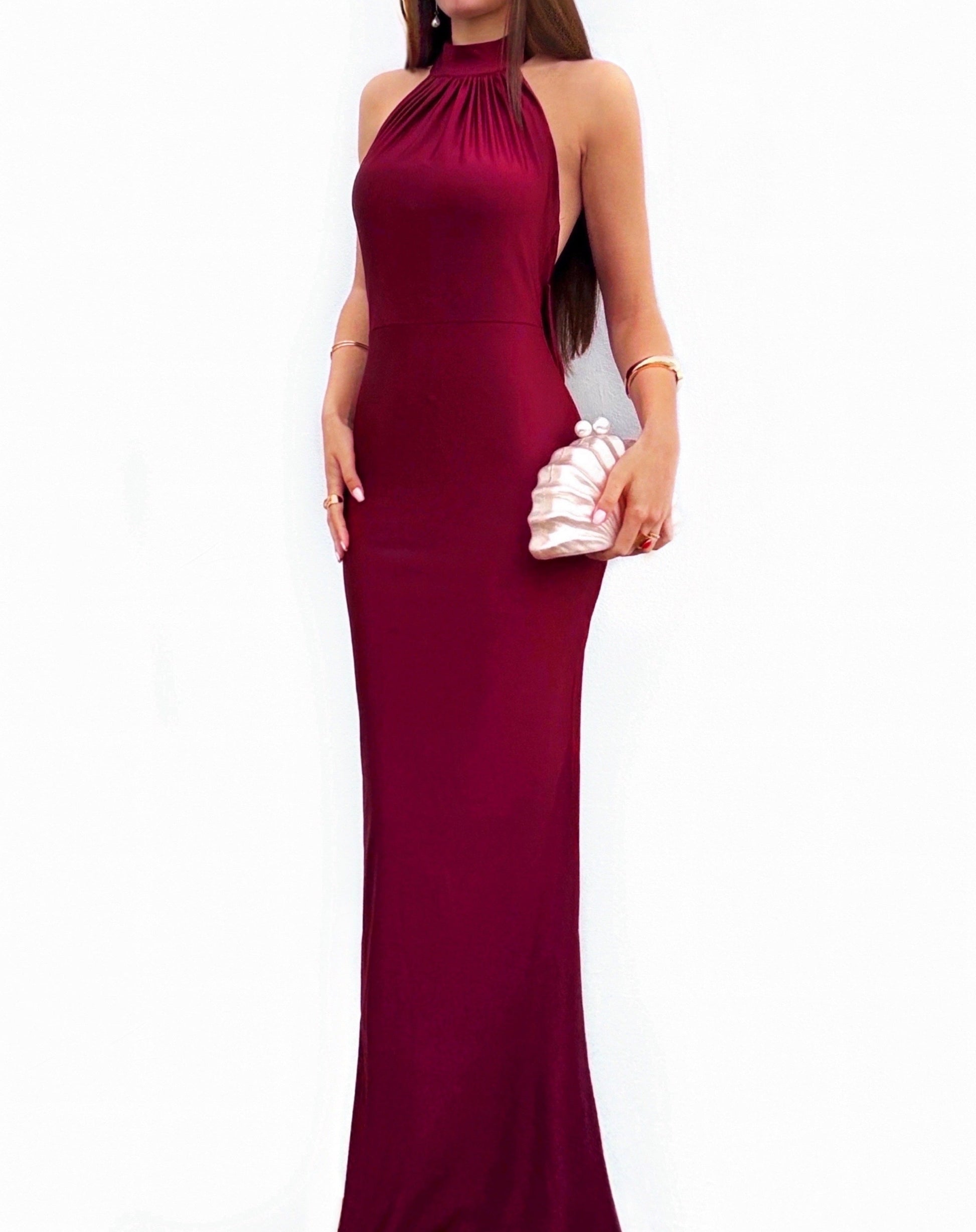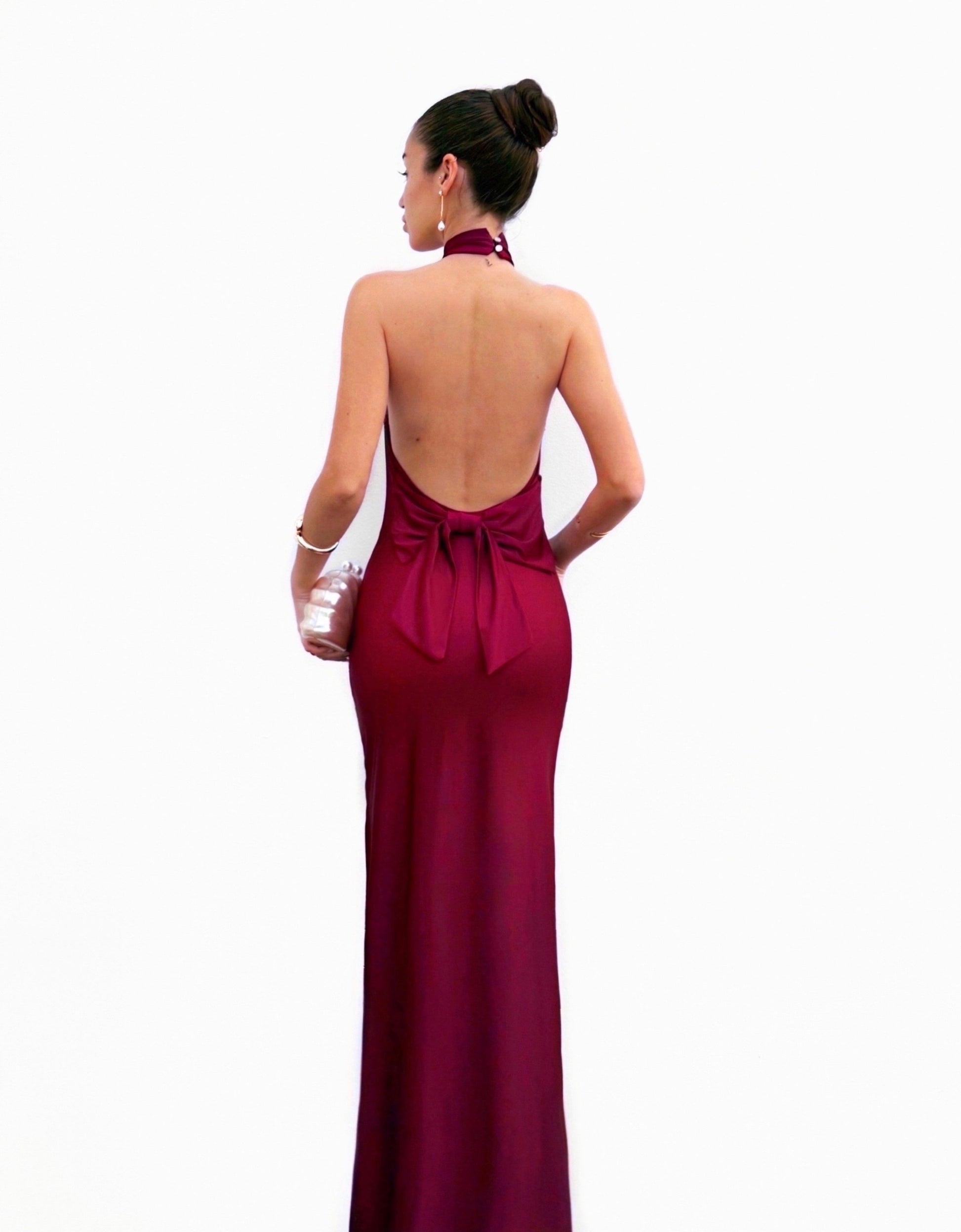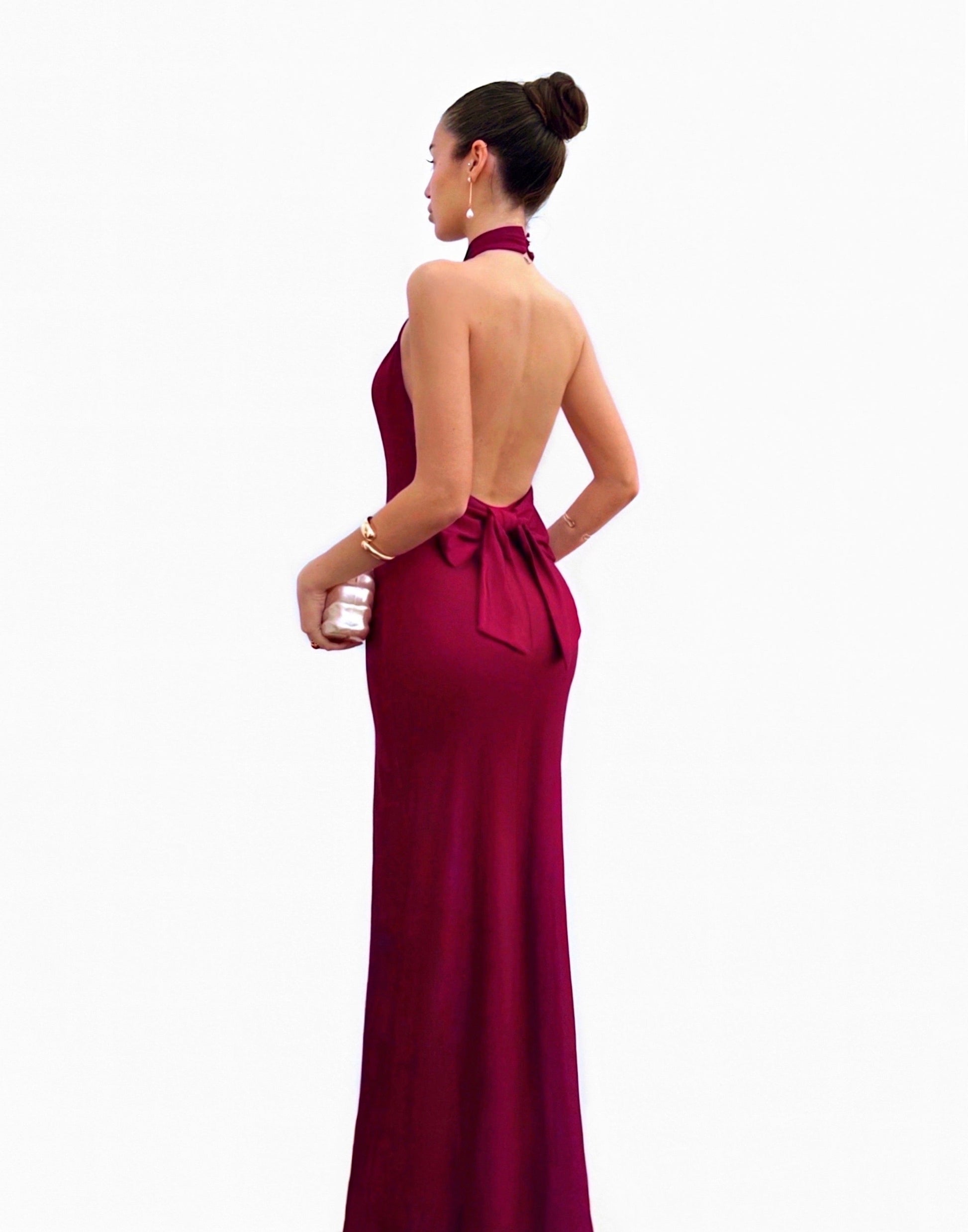 Vestido largo de tejido satinado y de color vino muy ajustado al cuerpo. Es un vestido muy elegante y sensual a la vez. Lleva cuello alto con frunce y espalda totalmente descubierta con detalle de lazo. Cierre con botones al cuello. Es muy elástico y cómodo, se adapta genial al cuerpo. Modelo de fabricación propia. Ideal para graduaciones, bodas, eventos...