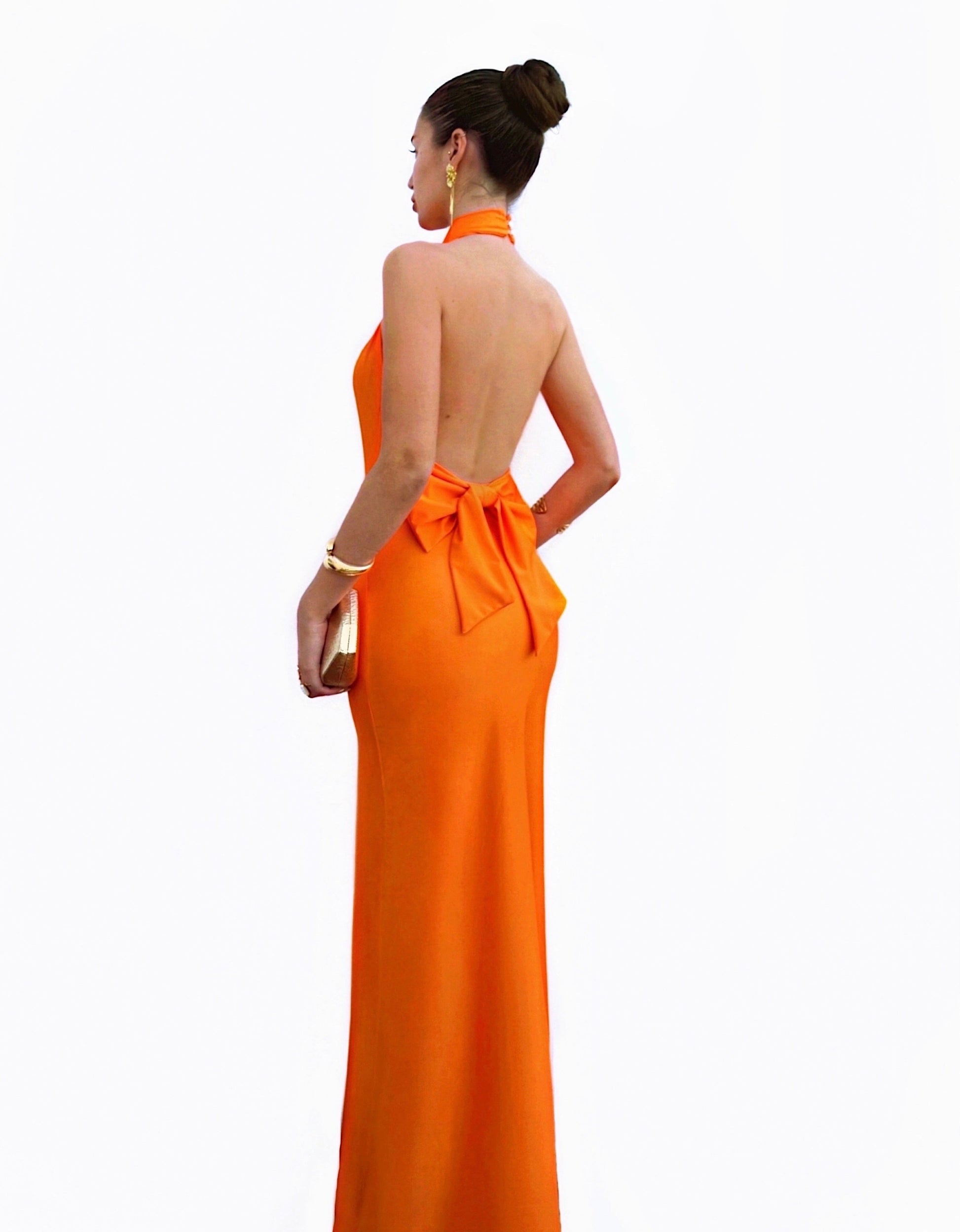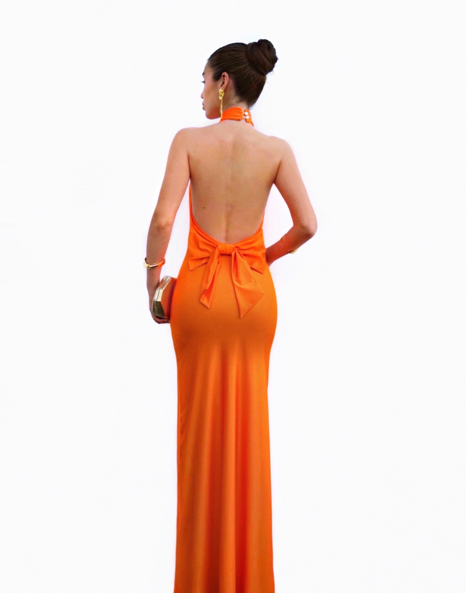 Vestido largo de tejido satinado y de color naranja muy ajustado al cuerpo. Es un vestido muy elegante y sensual a la vez. Lleva cuello alto con frunce y espalda totalmente descubierta con detalle de lazo. Cierre con botones al cuello. Es muy elástico y cómodo, se adapta genial al cuerpo. Modelo de fabricación propia. Ideal para graduaciones, bodas, eventos...