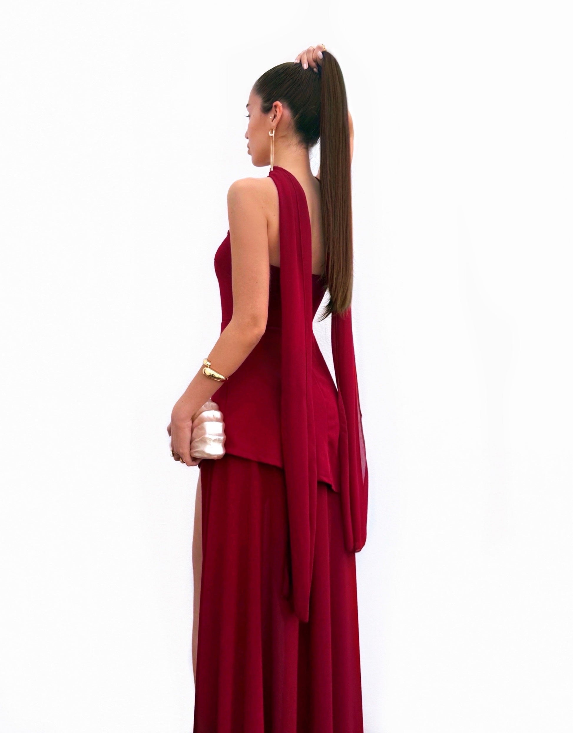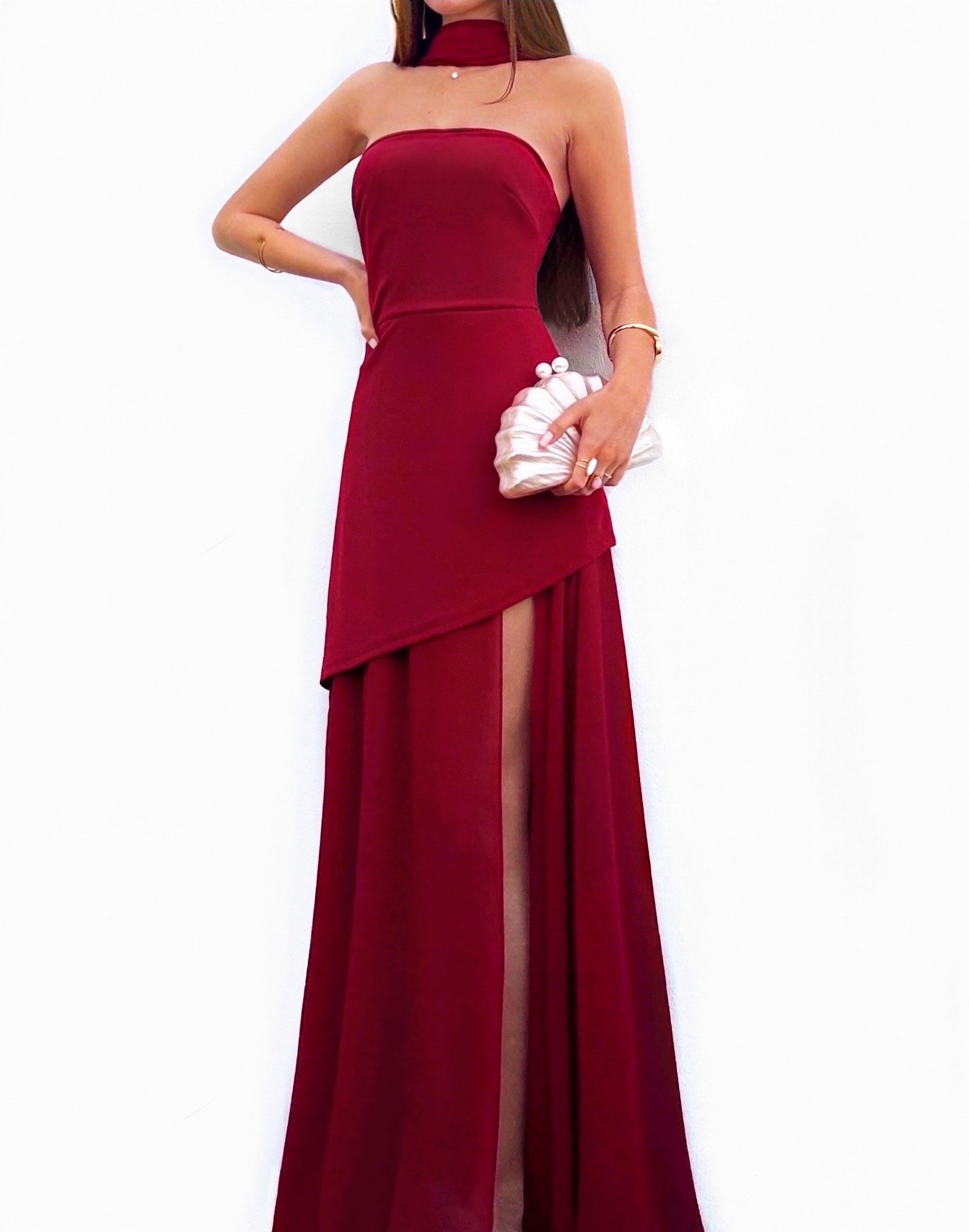 Vestido largo de tejido scubacrepe y de color burdeos muy ajustado al cuerpo. Lleva escote palabra de honor muy favorecedor y falda de gasa fluida con abertura en el lateral izquierdo. Tiene detalle de fular en el cuello y cremallera trasera. Lleva goma elástica. Ideal para graduaciones, bodas, eventos...