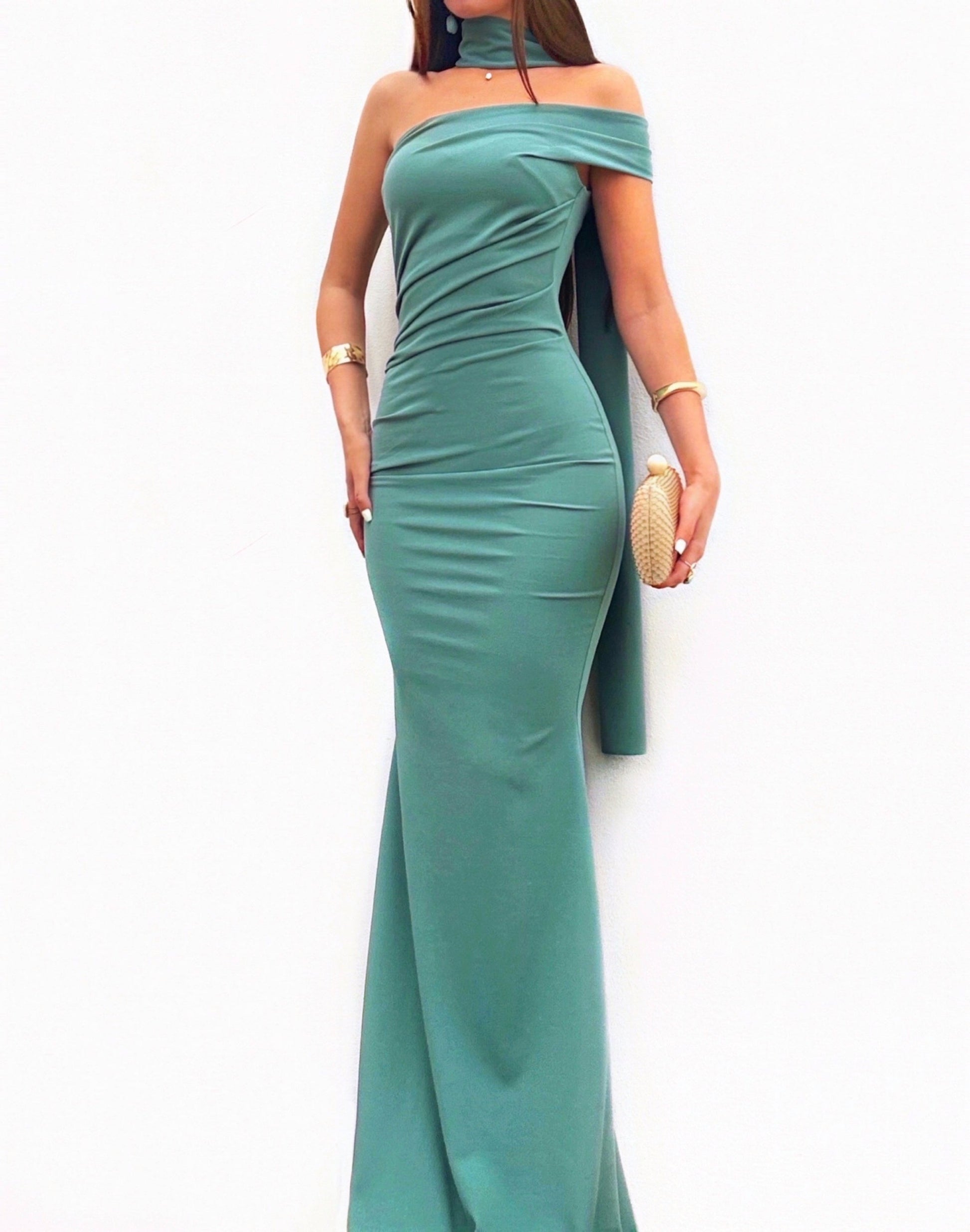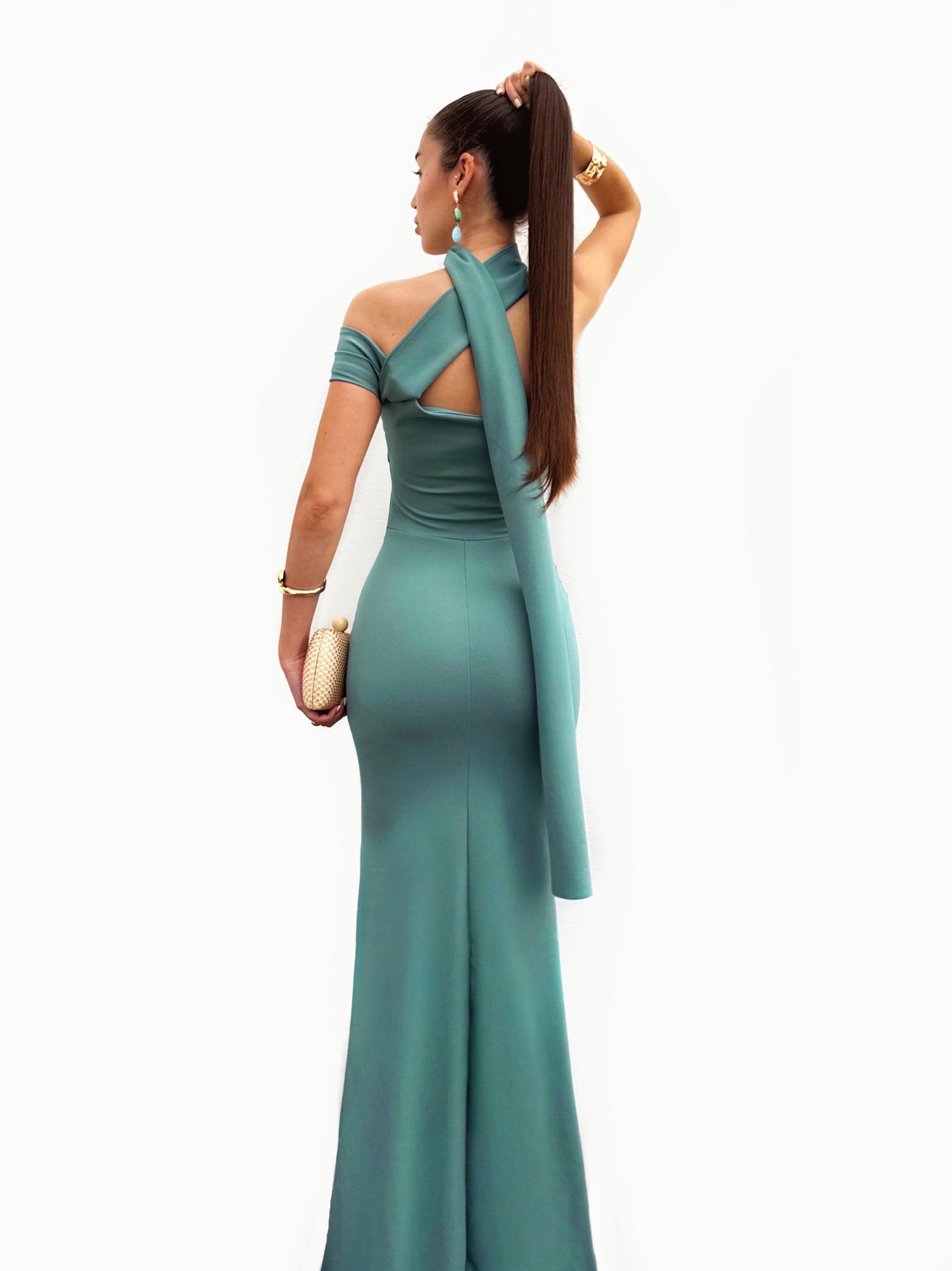 Vestido largo de tejido crepe elástico muy ajustado, realza las curvas del cuerpo. Lleva escote asimétrico muy favorecedor, copas en el pecho y cremallera invisible en un lateral. Lleva frunce en todo el cuerpo y tira larga que se puede llevar como choker. Ideal para graduaciones, bodas, eventos...
