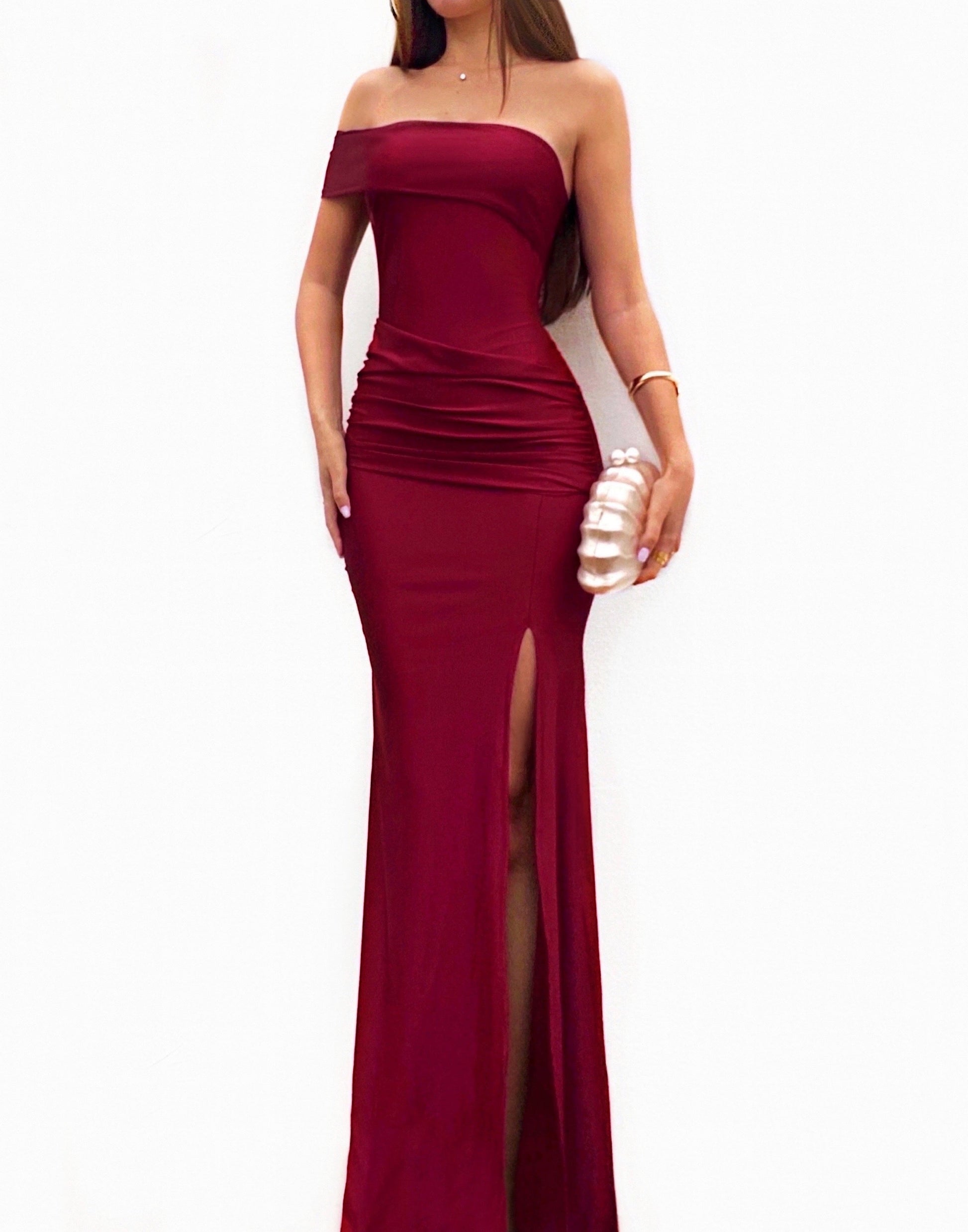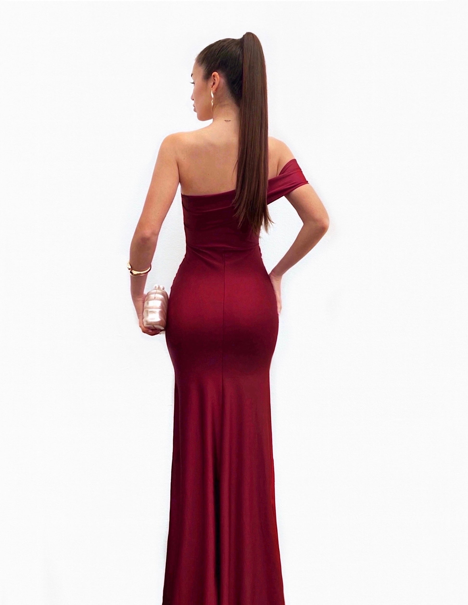 ¡Es tan sensual y elegante! Vestido largo muy ajustado, realza todas las curvas del cuerpo. Lleva cuello barco asimétrico con banda que deja un brazo al descubierto. Tiene cola de sirena con abertura lateral y banda en el centro. Es elástico. Ideal para graduaciones, bodas, eventos...