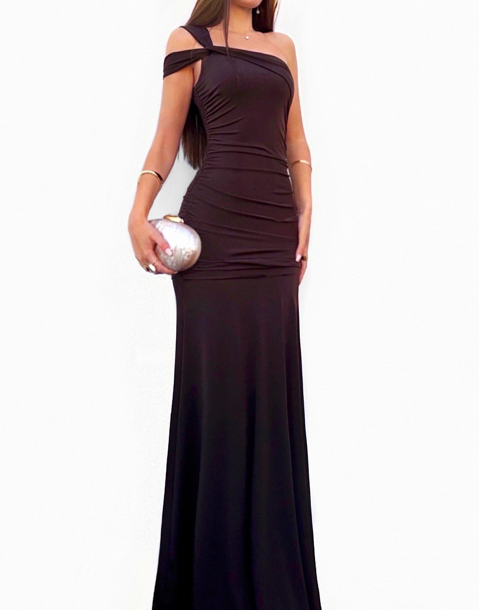 Vestido largo de tejido licra y de color chocolate muy ajustado al cuerpo. Lleva escote asimétrico, tirante de doble cruce en el lado izquierdo y frunces en los laterales del abdomen que llegan hasta la cadera. La falda lleva capa larga y abertura lateral. Es elástico. Ideal para graduaciones, bodas, eventos...