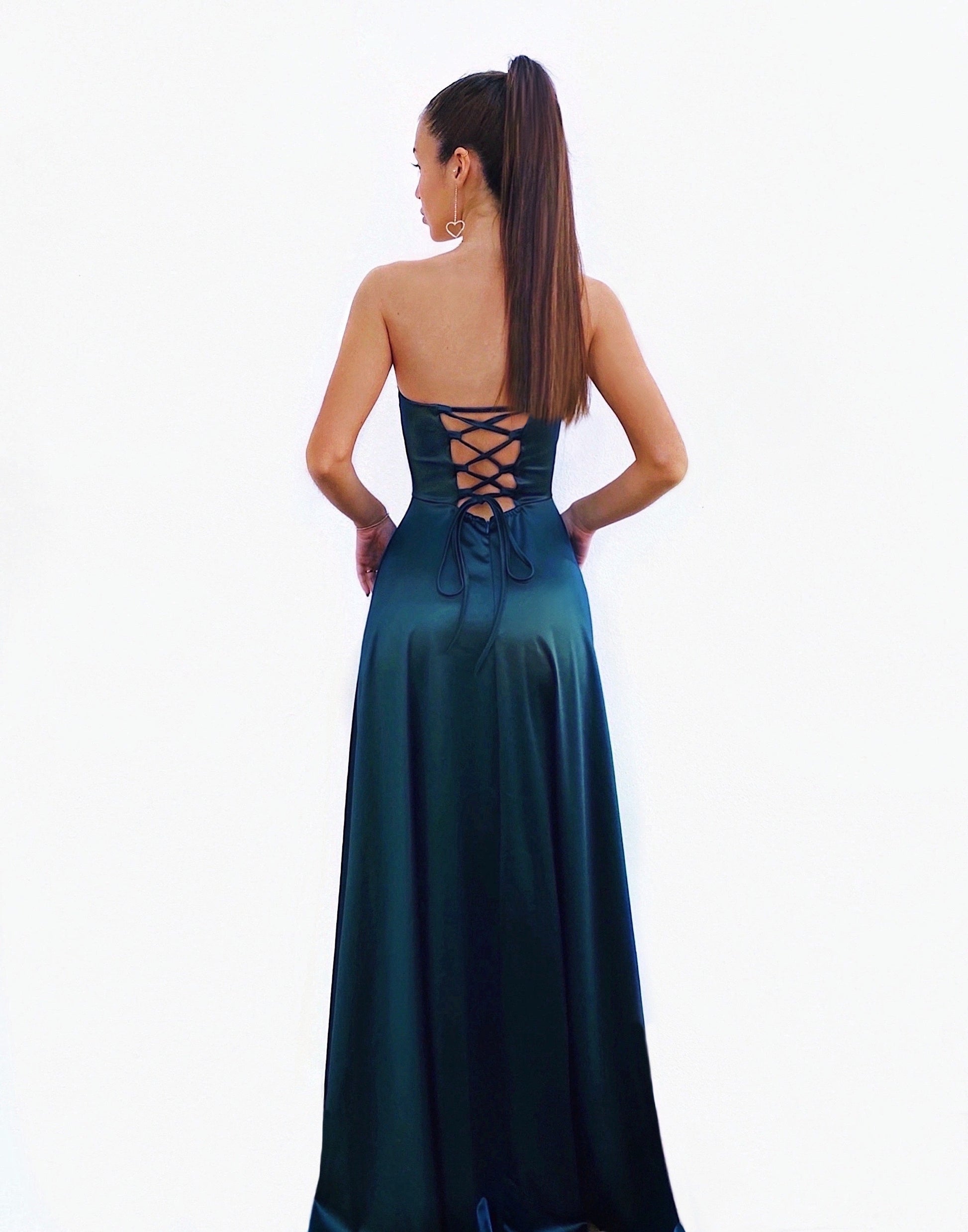 Vestido largo de color azul petróleo y de tejido satinado con corte princesa muy elegante. Lleva corsé regulable para que puedas ajustarlo a tu medida ideal. También tiene copas en el pecho y abertura en un lateral. Es elástico. Ideal para bodas, graduaciones, eventos...