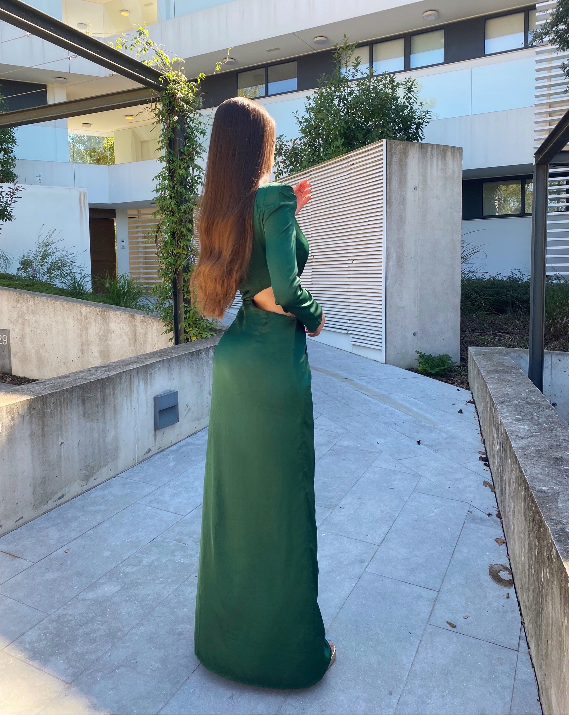 Vestido largo y ajustado al cuerpo de color verde botella. Es de tejido raso, lleva hombrera, manga larga y escote asimétrico muy favorecedor. Tiene copas en el pecho, abertura en el cuerpo y también en la falda, en el lado izquierdo. Ideal para graduaciones, bodas, eventos...