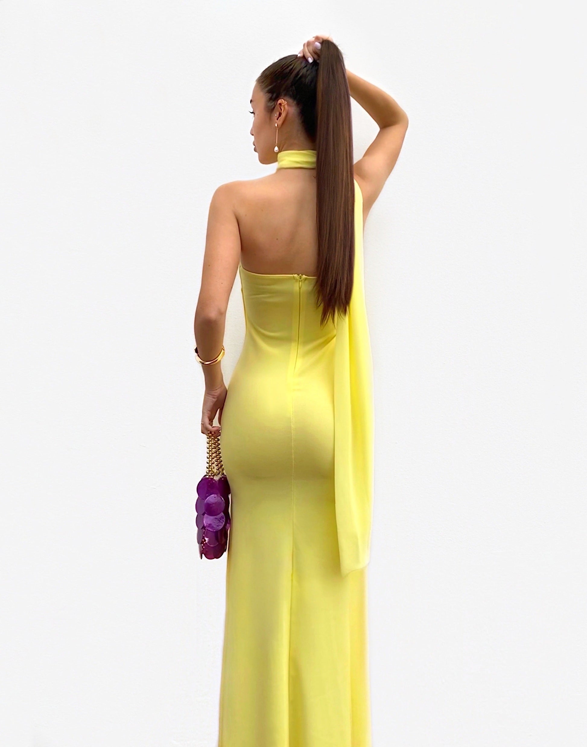 Vestido largo de tejido scubacrepe muy ajustado al cuerpo con corte sirena. Lleva escote palabra de honor, copas y detalle de chal con gasa muy elegante. Lleva cremallera en la espalda. Ideal para bodas, graduaciones, eventos...