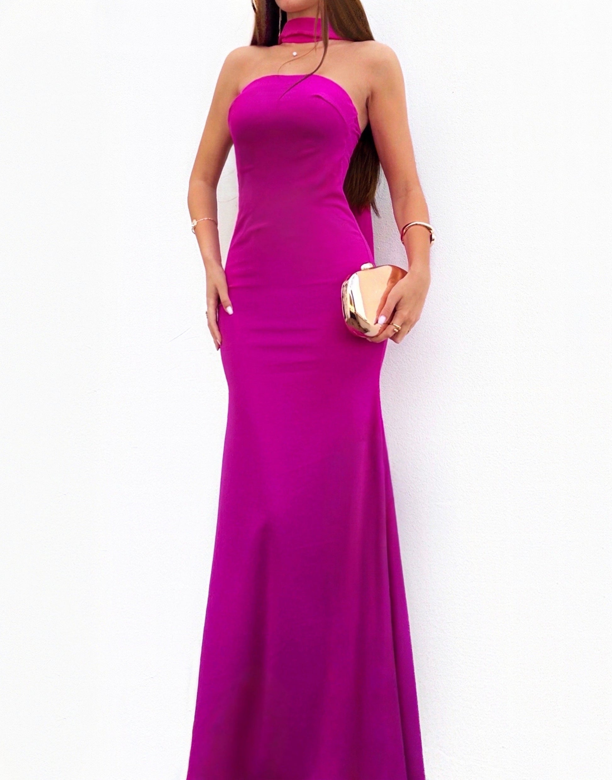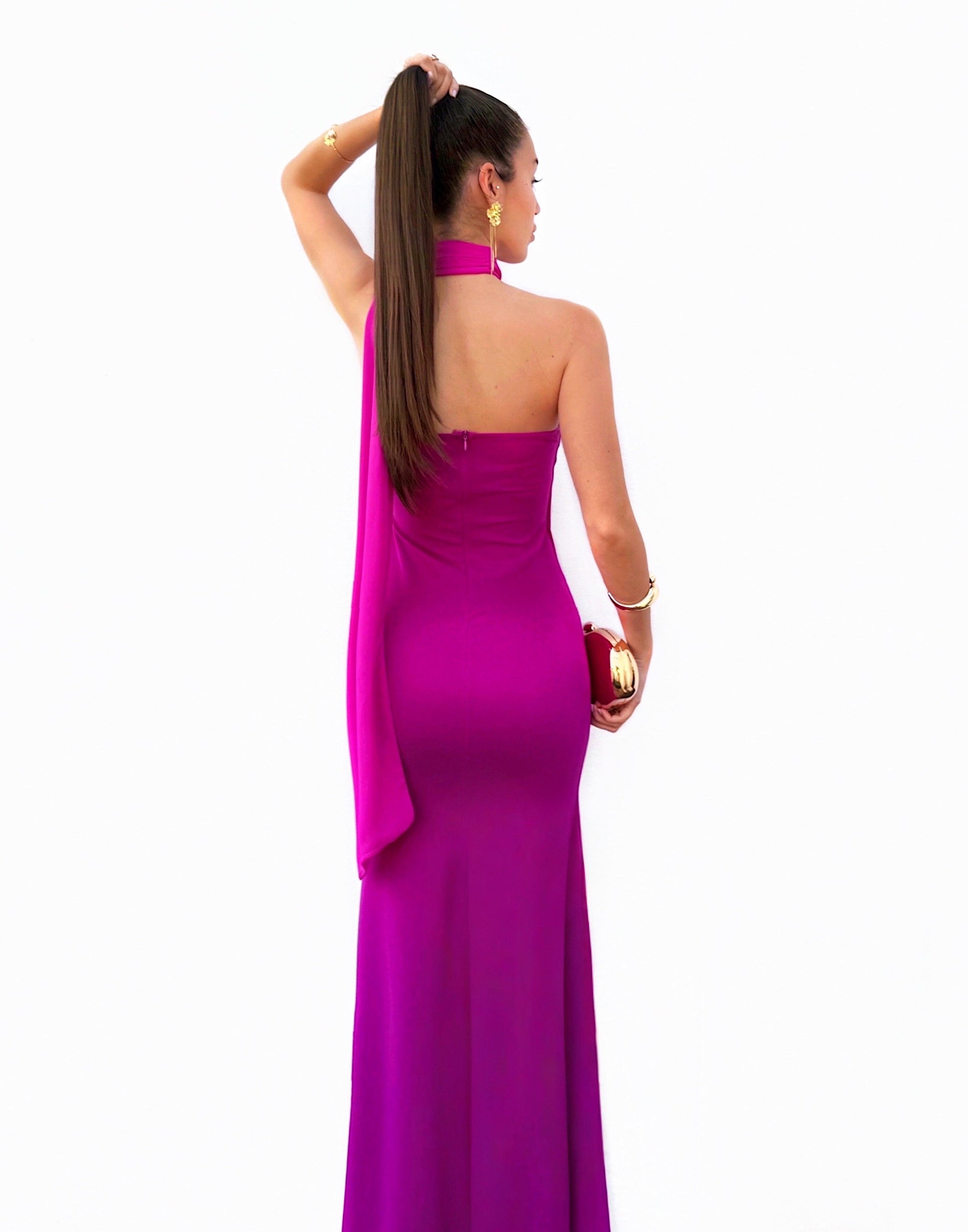 Vestido largo de tejido scubacrepe muy ajustado al cuerpo con corte sirena. Lleva escote palabra de honor, copas y detalle de chal con gasa muy elegante. Lleva cremallera en la espalda. Ideal para bodas, graduaciones, eventos...