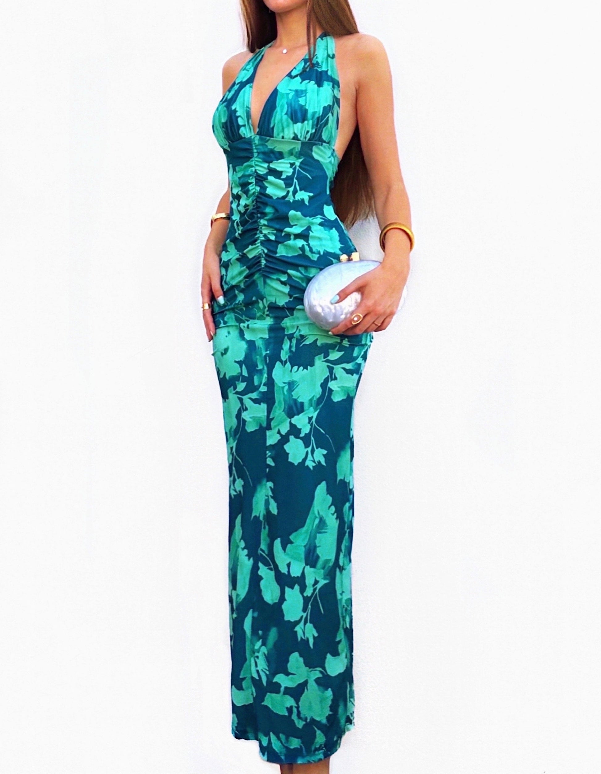 Vestido midi de tejido licra con estampado de flores muy ajustado al cuerpo. Lleva escote en V muy favorecedor y frunce en la parte delantera del vestido. Es elástico y muy cómodo. Ideal para tardes y cenas de verano, cocktails, fiestas...