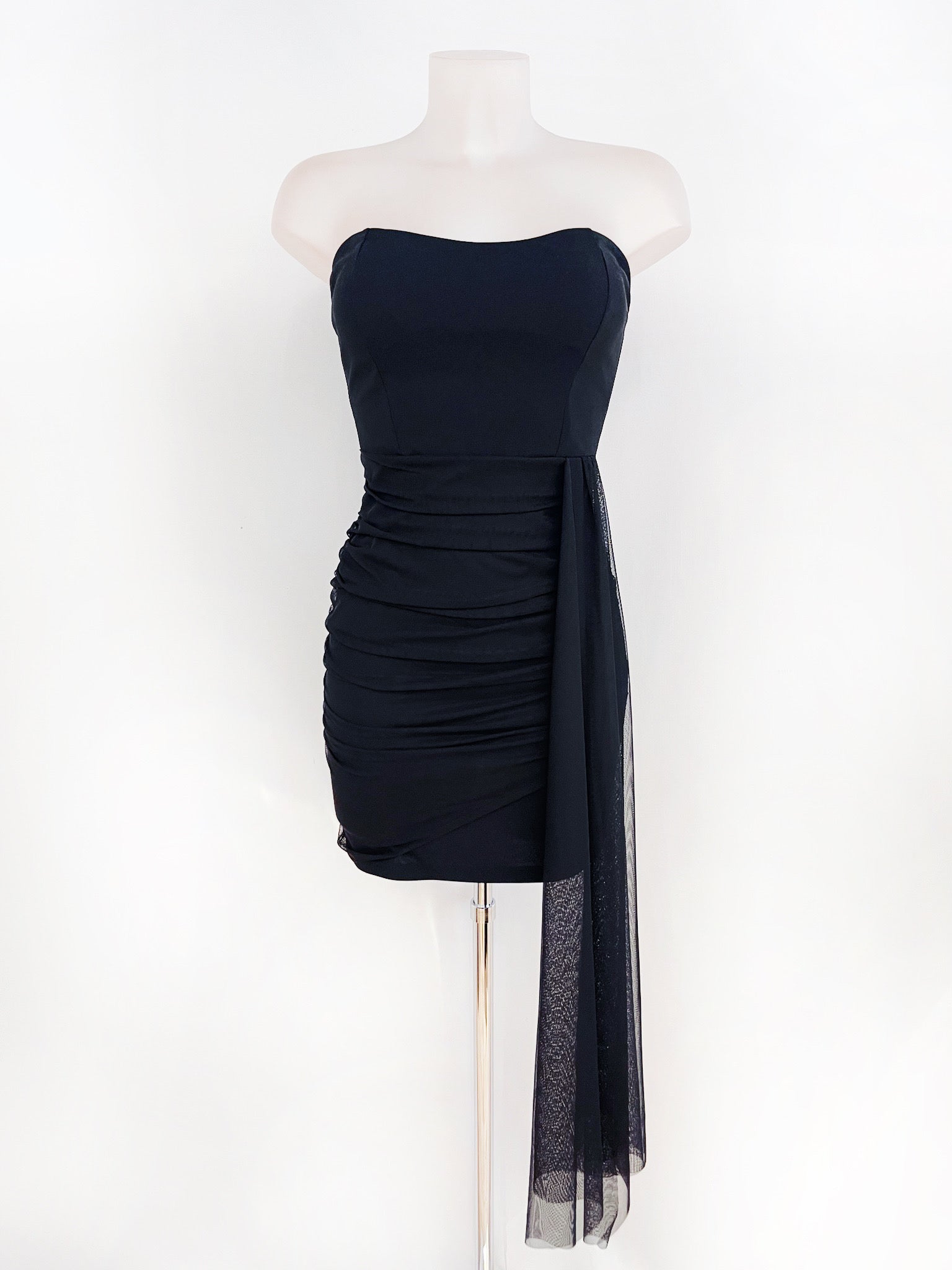Vestido corto y ajustado al cuerpo de color negro. Lleva escote palabra de honor muy favorecedor en forma de corazón, copas en el pecho y frunce en la falda para poder ajustar el largo a tu medida ideal. También lleva detalle de tela en el lateral izquierdo que le da un toque muy elegante y goma elástica en la parte trasera. Ideal para ocio nocturno, graduaciones, cenas elegantes, eventos, aniversarios, etc.