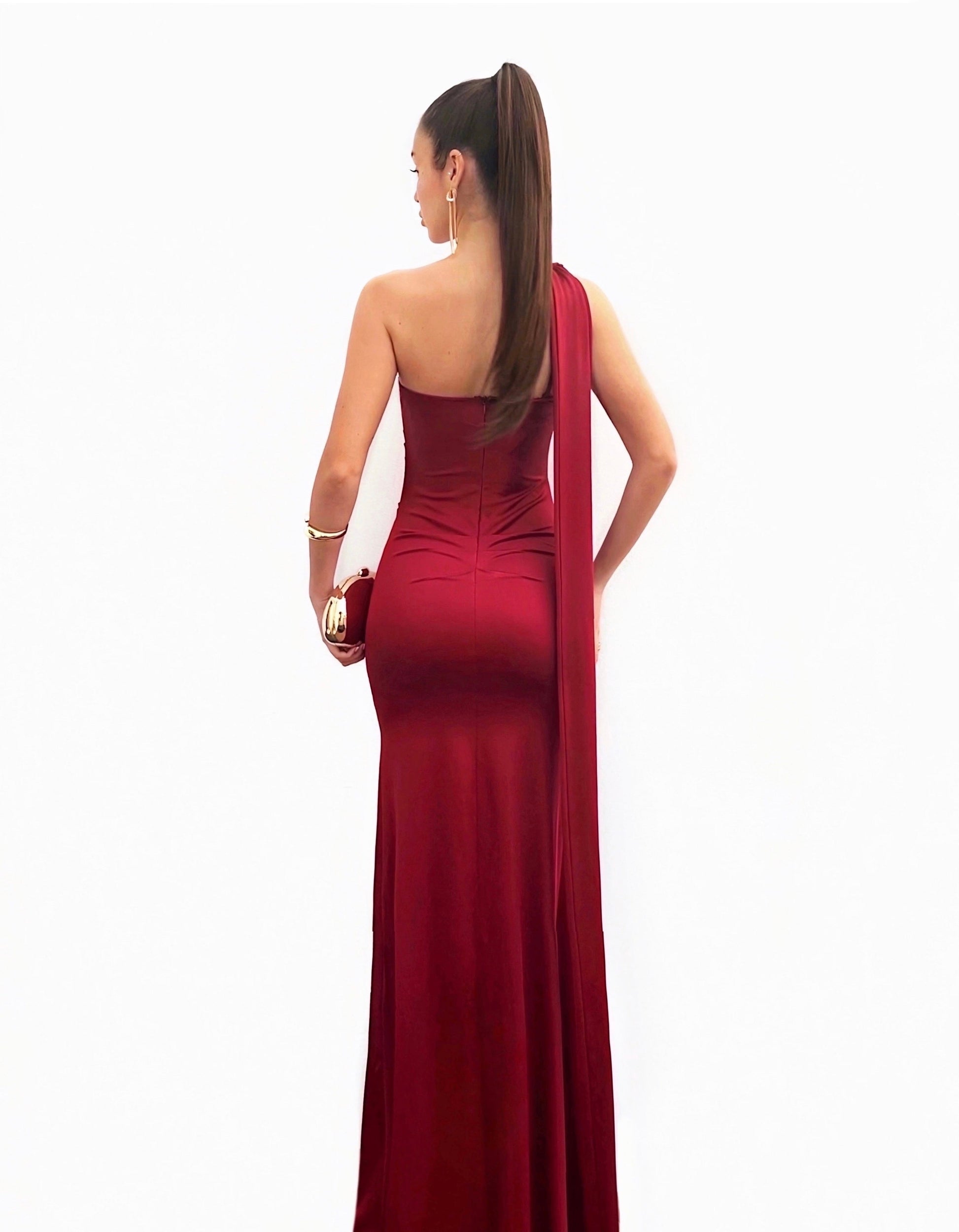 Vestido largo de tejido satinado y de color burdeos muy ajustado al cuerpo. Lleva escote asimétrico, frunce en el cuerpo y en la parte trasera, copas en el pecho y detalle de capa larga en el hombro derecho que le da un toque muy elegante y favorecedor. Abertura en la pierna en el lado izquierdo. Cremallera tasera invisible. Elástico. Ideal para graduaciones, bodas, eventos...