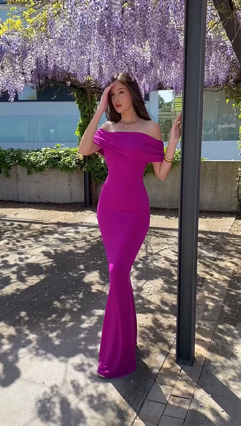 Vestido largo de color buganvilla muy ajustado al cuerpo. Lleva escote bardot y detalle de nudo invertido. Lleva espalda al aire que le da un toque muy elegante y a la vez sensual. Ideal para bodas, graduaciones, eventos, aniversarios...