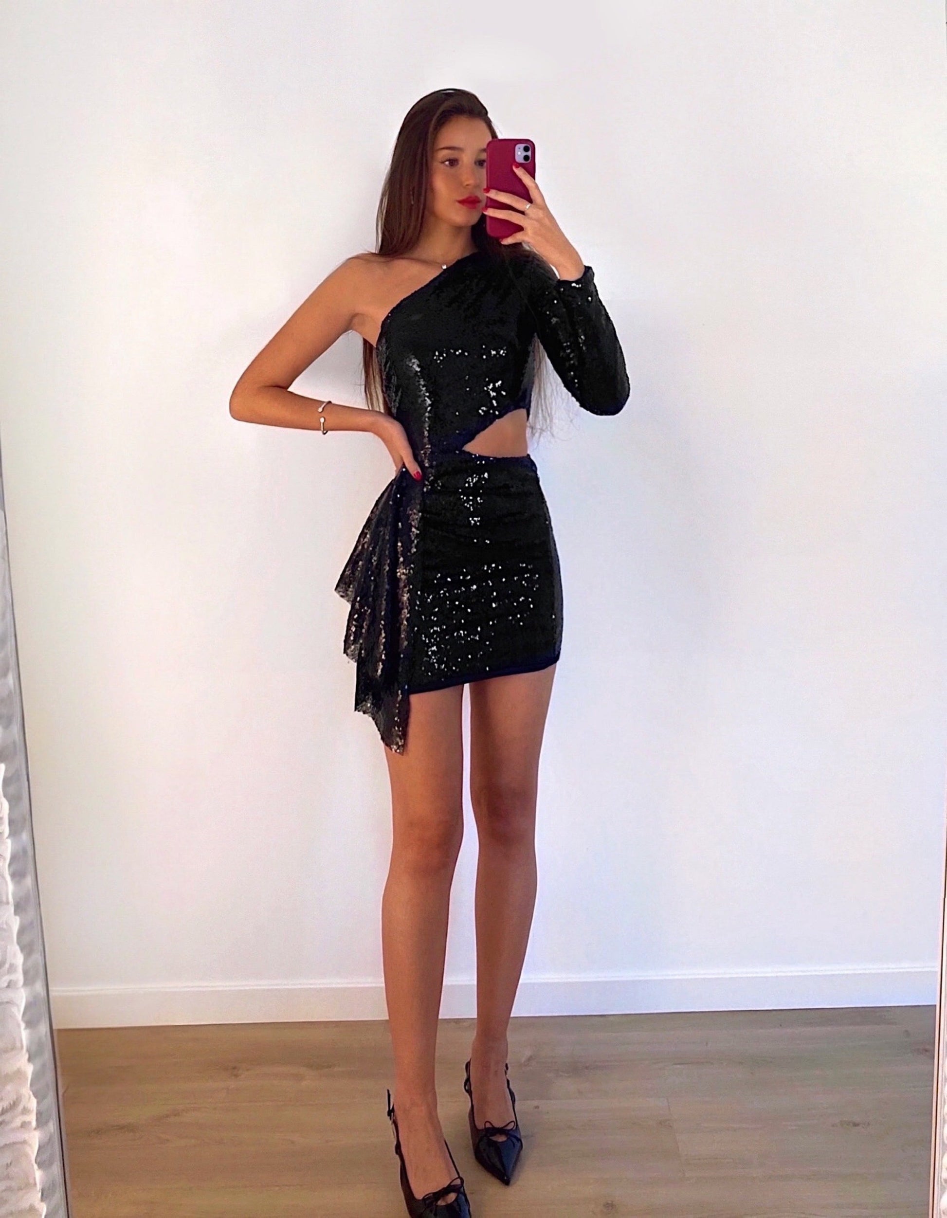 Vestido de lentejuelas mini y de color negro muy ajustado al cuerpo. Lleva escote y manga asimétrica, detalle de volante en el lado izquierdo y abertura en el lateral derecho. Ideal para Navidad, eventos, fiestas...