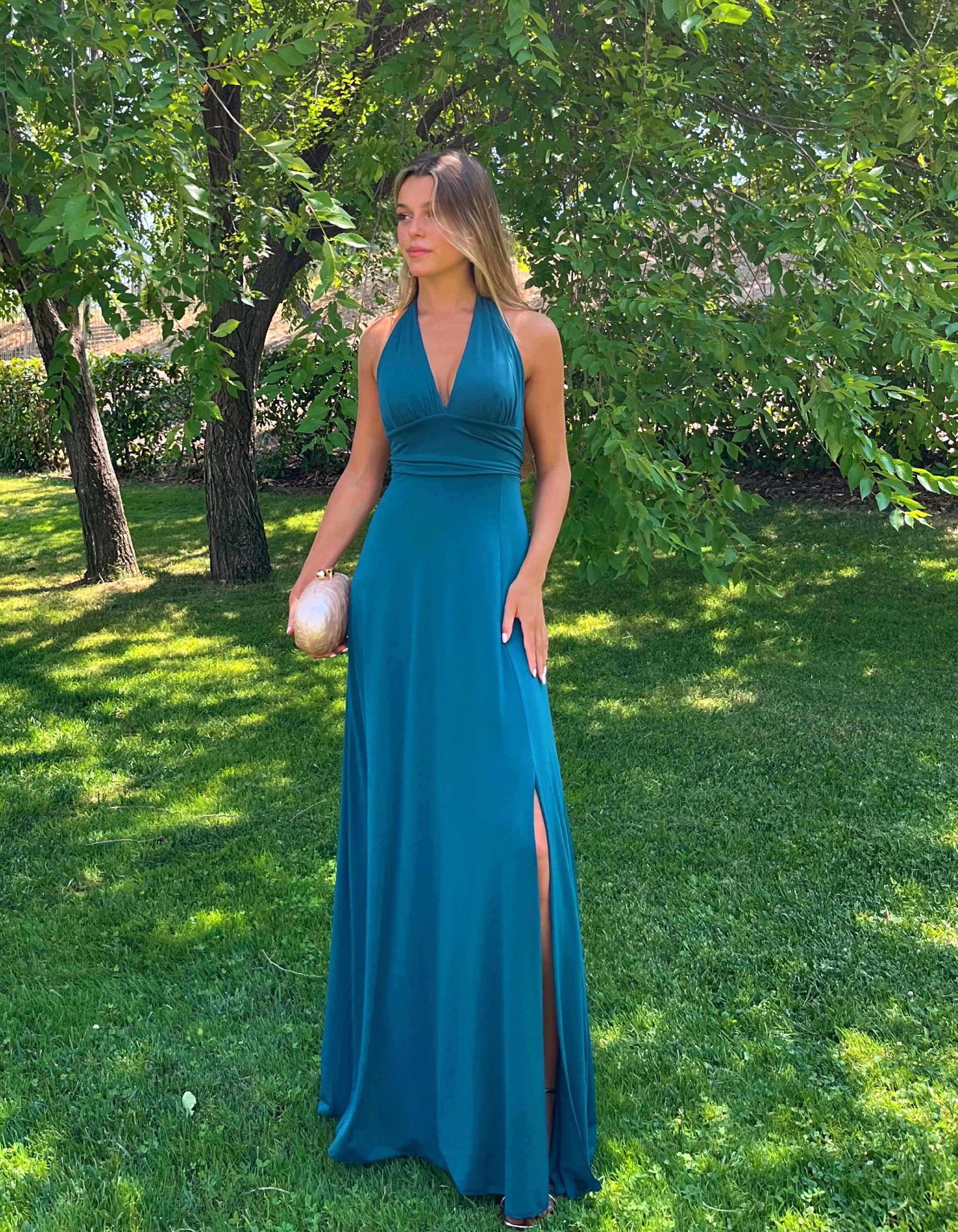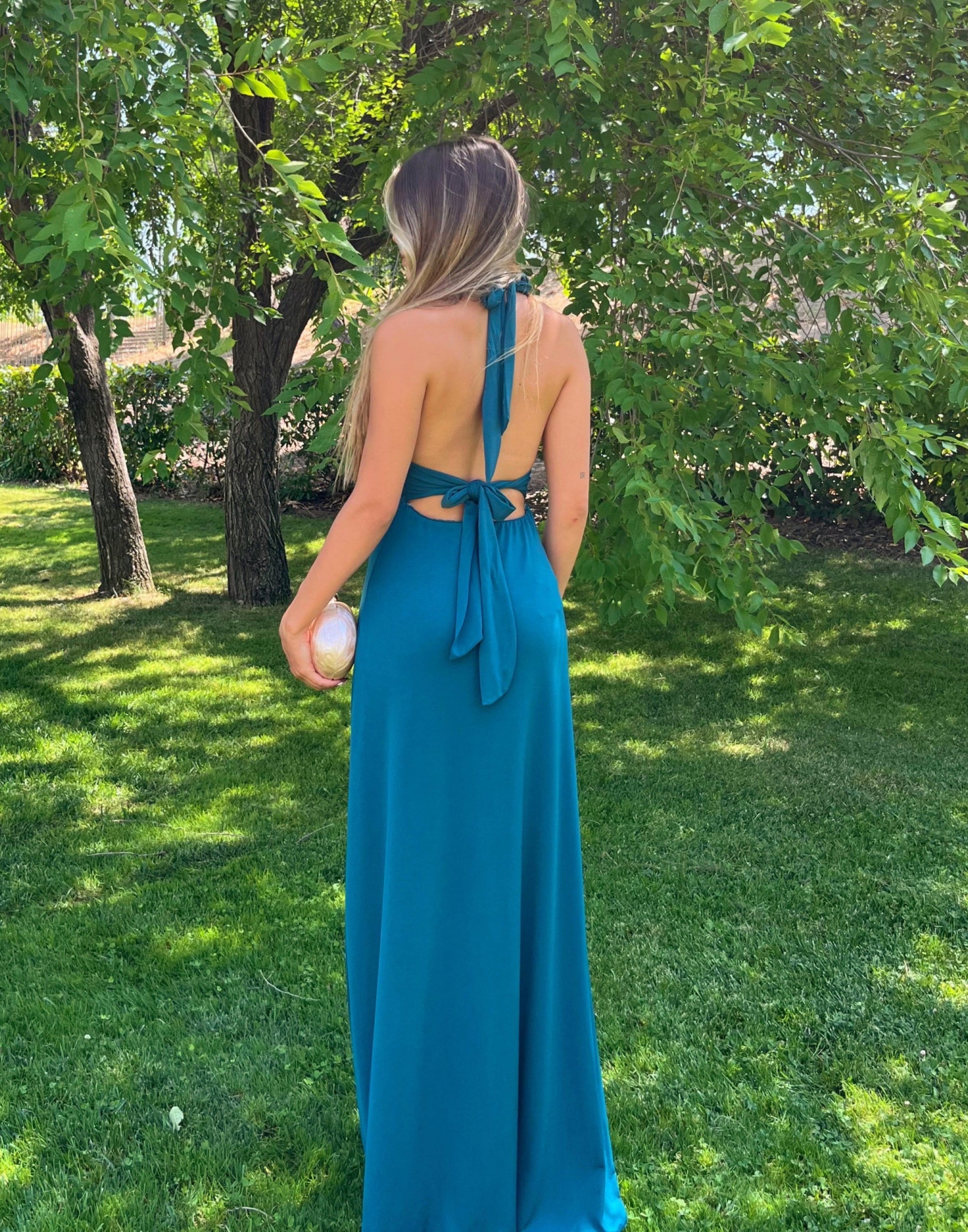 Vestido largo de tejido licra muy ajustado al cuerpo. Lleva escote en V pronunciado y va atado al cuello y en el abdomen para realizar la cintura. Tiene frunce en el escote y detalle de banda. Muy elástico, se adapta al cuerpo. Ideal para bodas, graduaciones, días y noches de verano, fiestas...