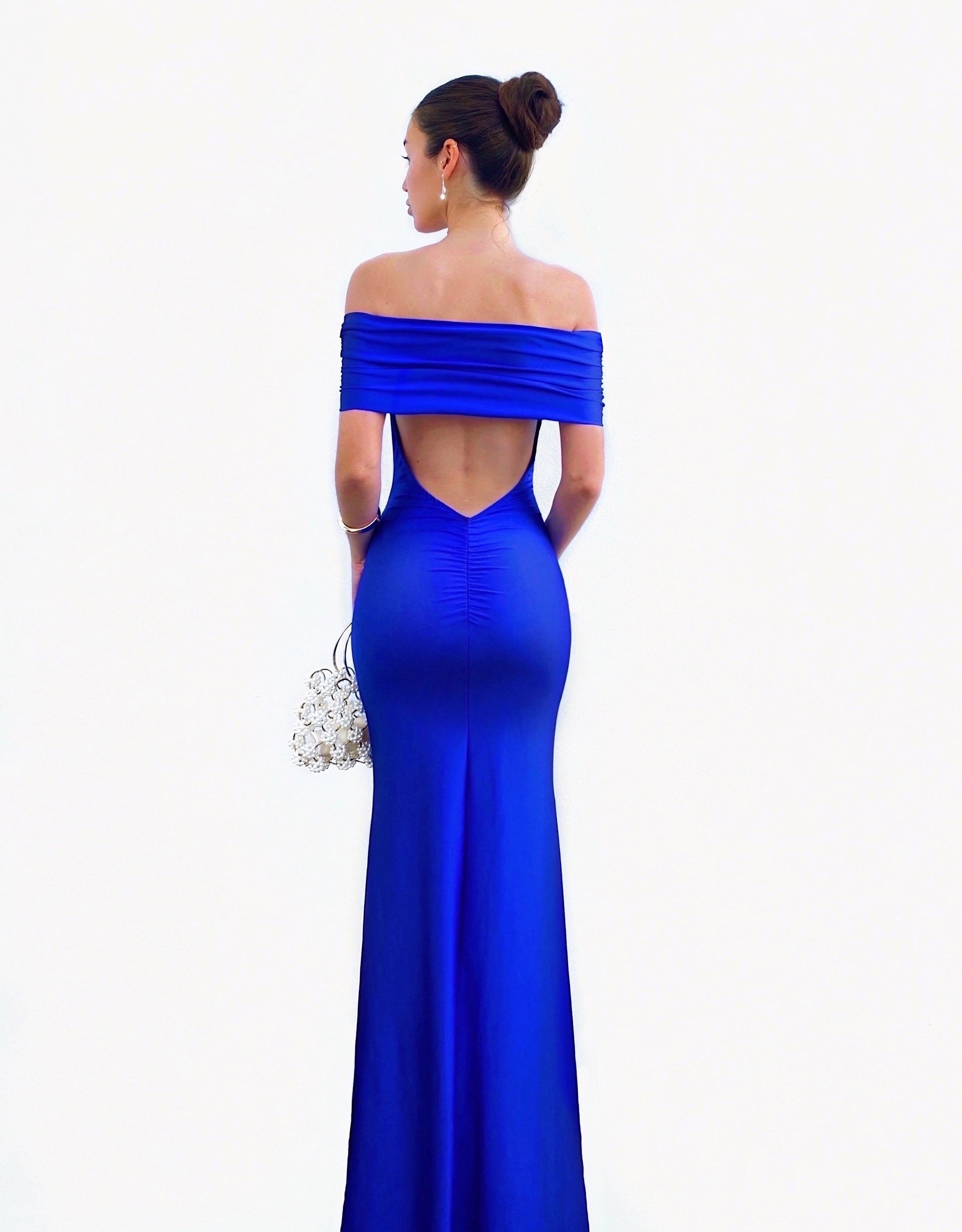 Vestido largo de tejido satinado y de color azul klein muy ajustado al cuerpo. Tiene escote bardot y lleva espalda al aire que le da un toque muy elegante y a la vez sensual. Ideal para bodas, graduaciones, eventos, aniversarios...
