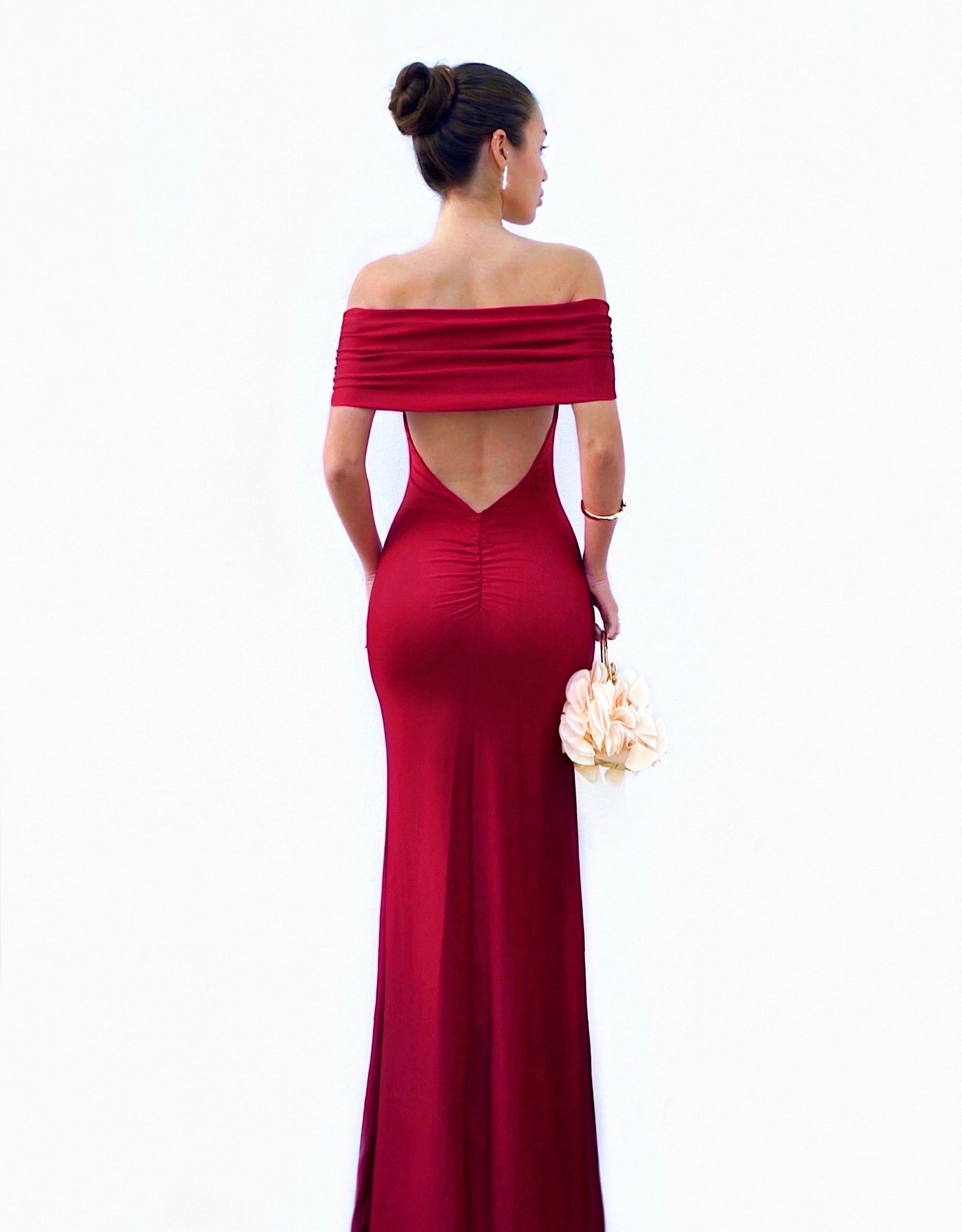 Vestido largo de tejido satinado y de color burdeos muy ajustado al cuerpo. Tiene escote bardot y lleva espalda al aire que le da un toque muy elegante y a la vez sensual. Ideal para bodas, graduaciones, eventos, aniversarios...