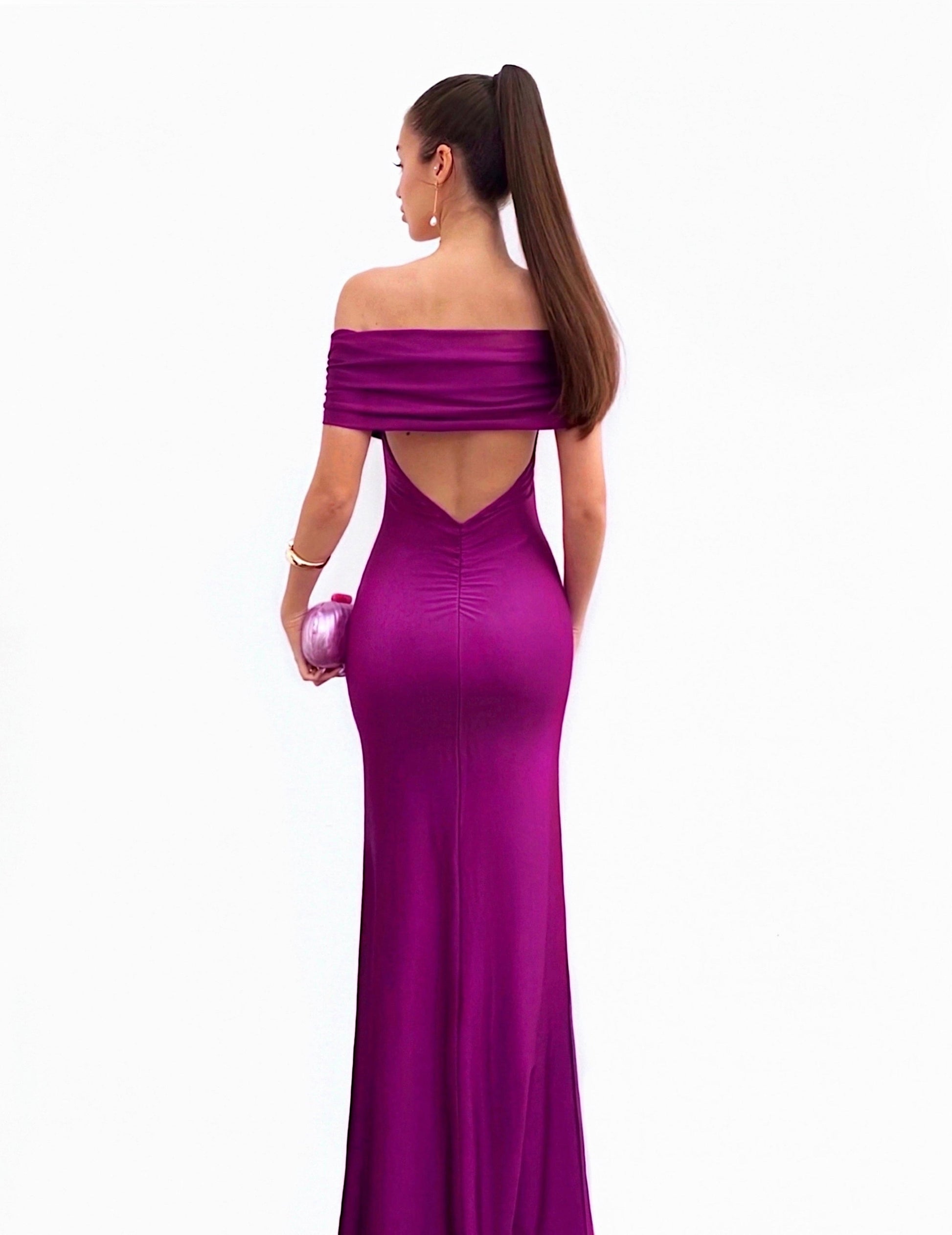 Vestido largo de tejido satinado y de color morado muy ajustado al cuerpo. Tiene escote bardot y lleva espalda al aire que le da un toque muy elegante y a la vez sensual. Ideal para bodas, graduaciones, eventos, aniversarios...