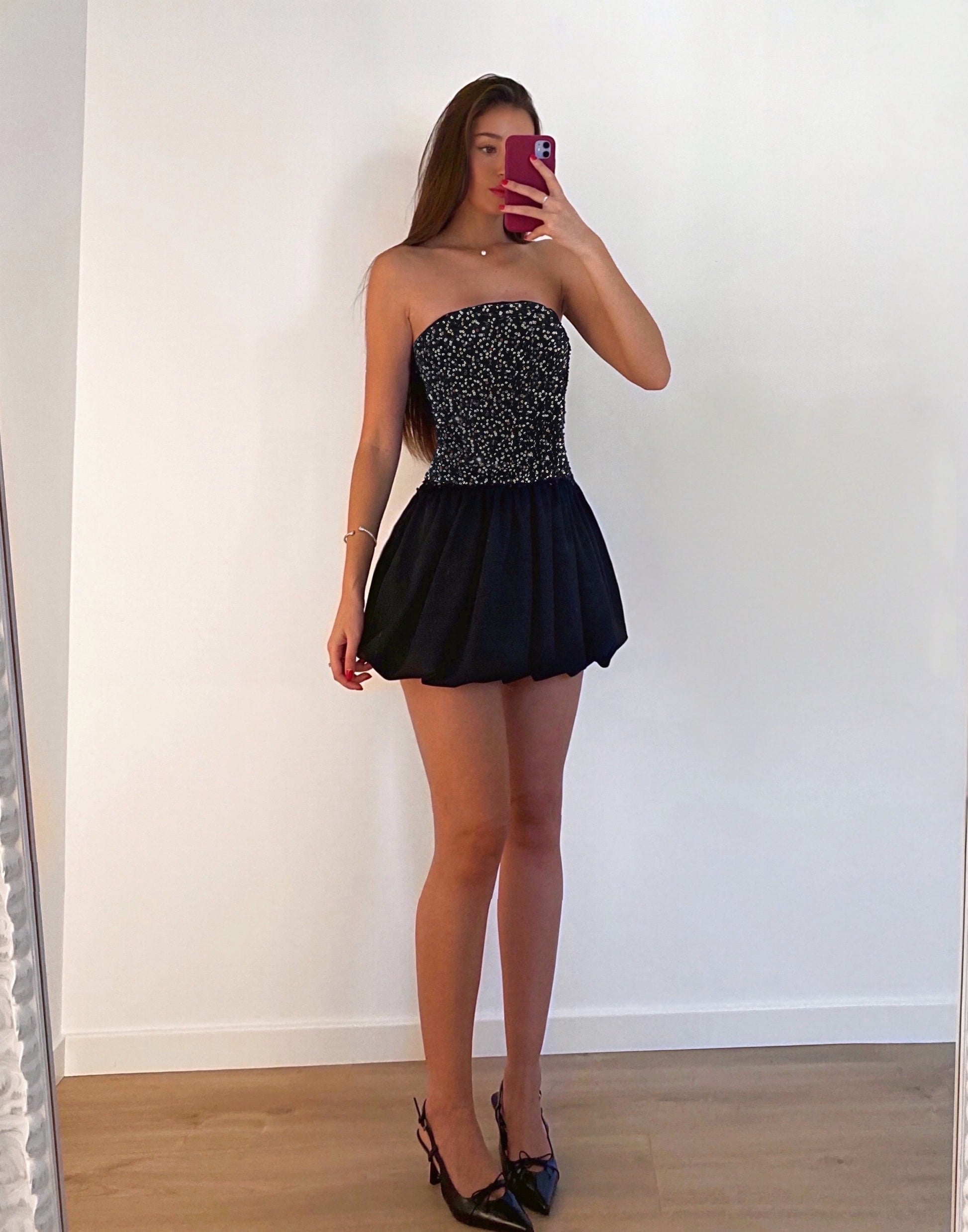 Vestido mini de tejido aterciopelado con lentejuelas y de color plata. Es muy elástico y muy ajustado al cuerpo. Lleva escote palabra de honor y vuelo en la falda. Ideal para Navidad, eventos, fiestas, ocio nocturno...