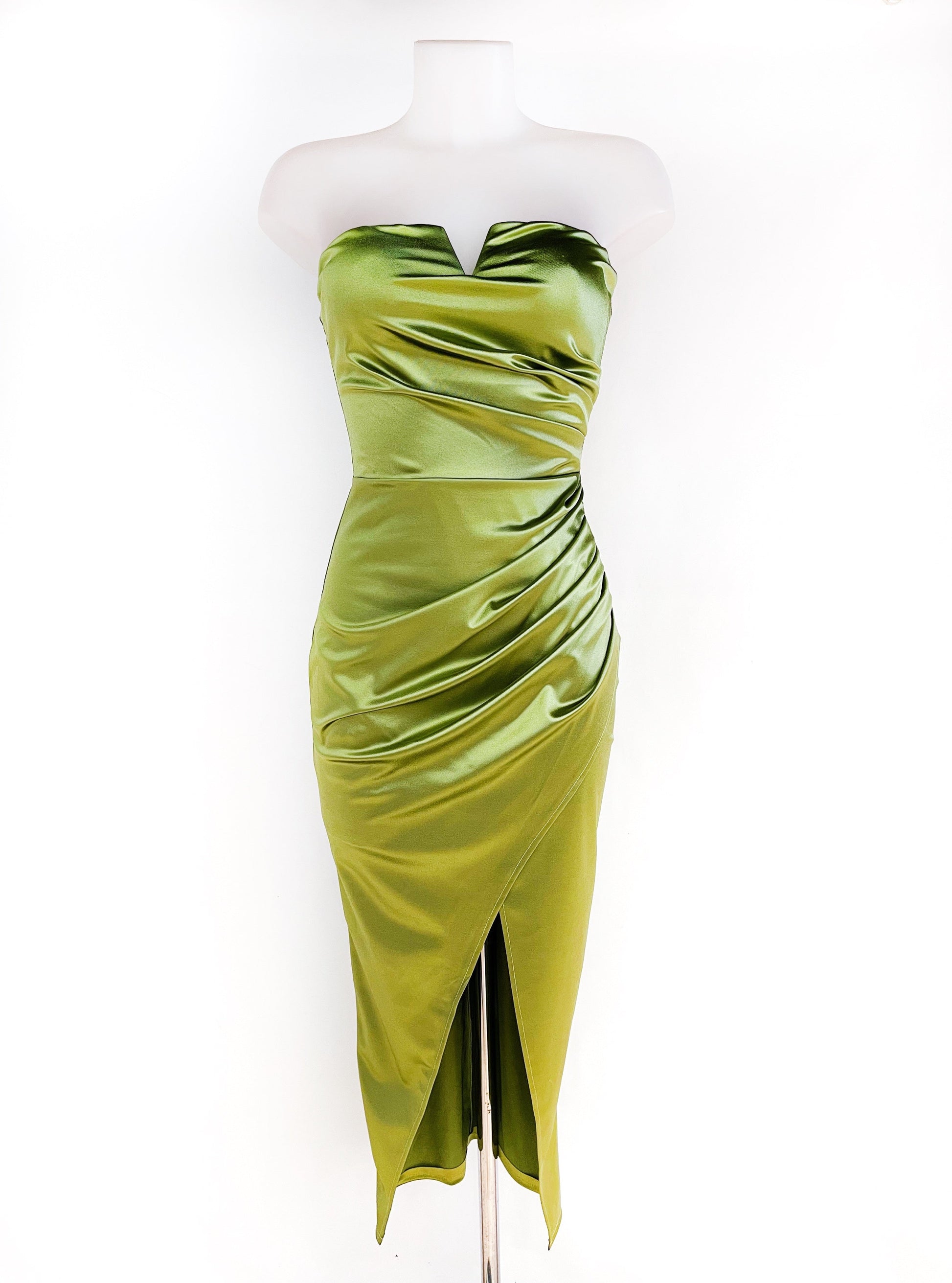 Brutal este color! Vestido midi de tejido raso, ajustado al cuerpo y de color verde oliva. Lleva escote palabra de honor en forma de corazón súper favorecedor, copas en el pecho para que puedas ir sin sujetador, abertura en la pierna y cremallera invisible por detrás. Tiene todo el cuerpo fruncido para que se adapte genial al cuerpo.