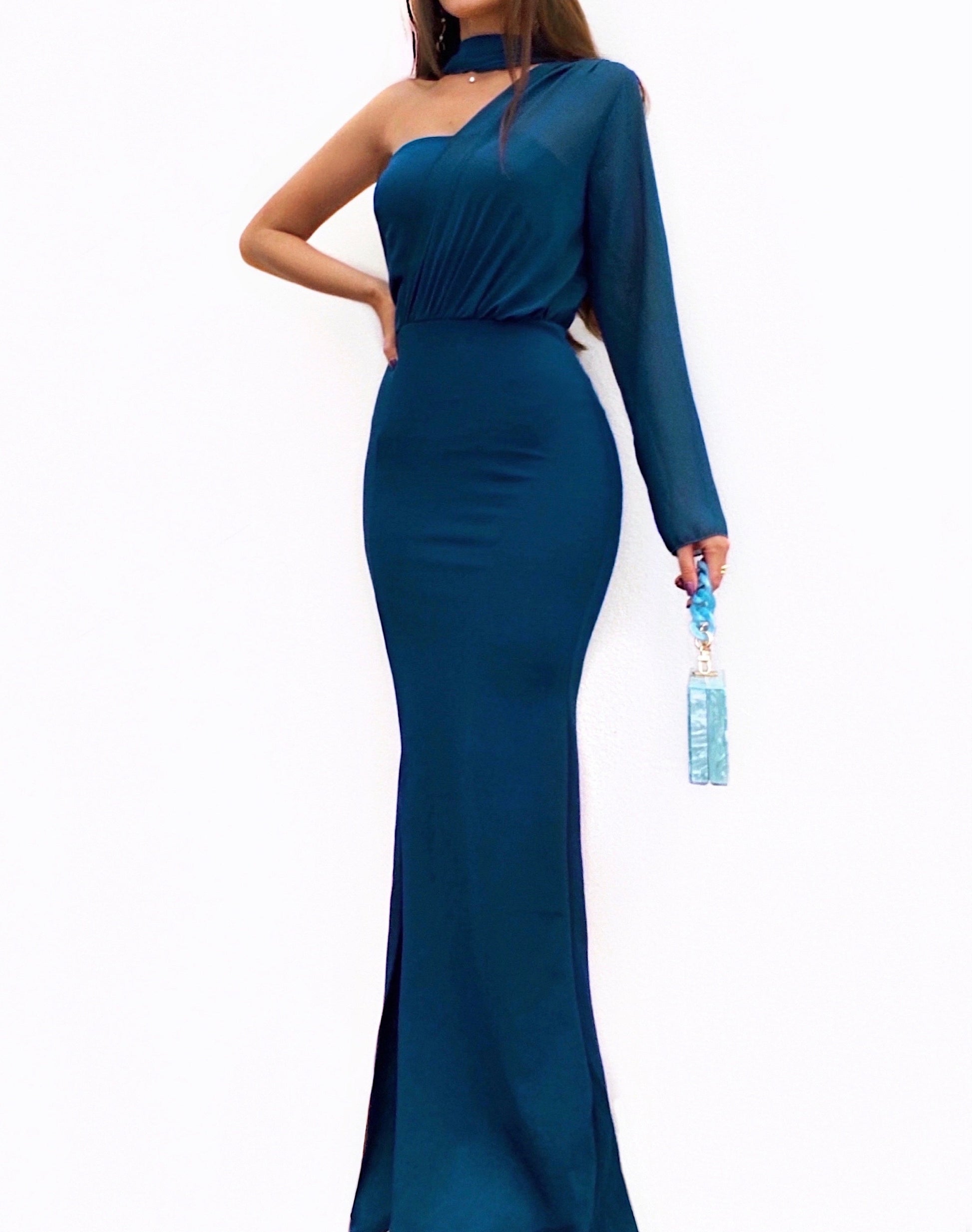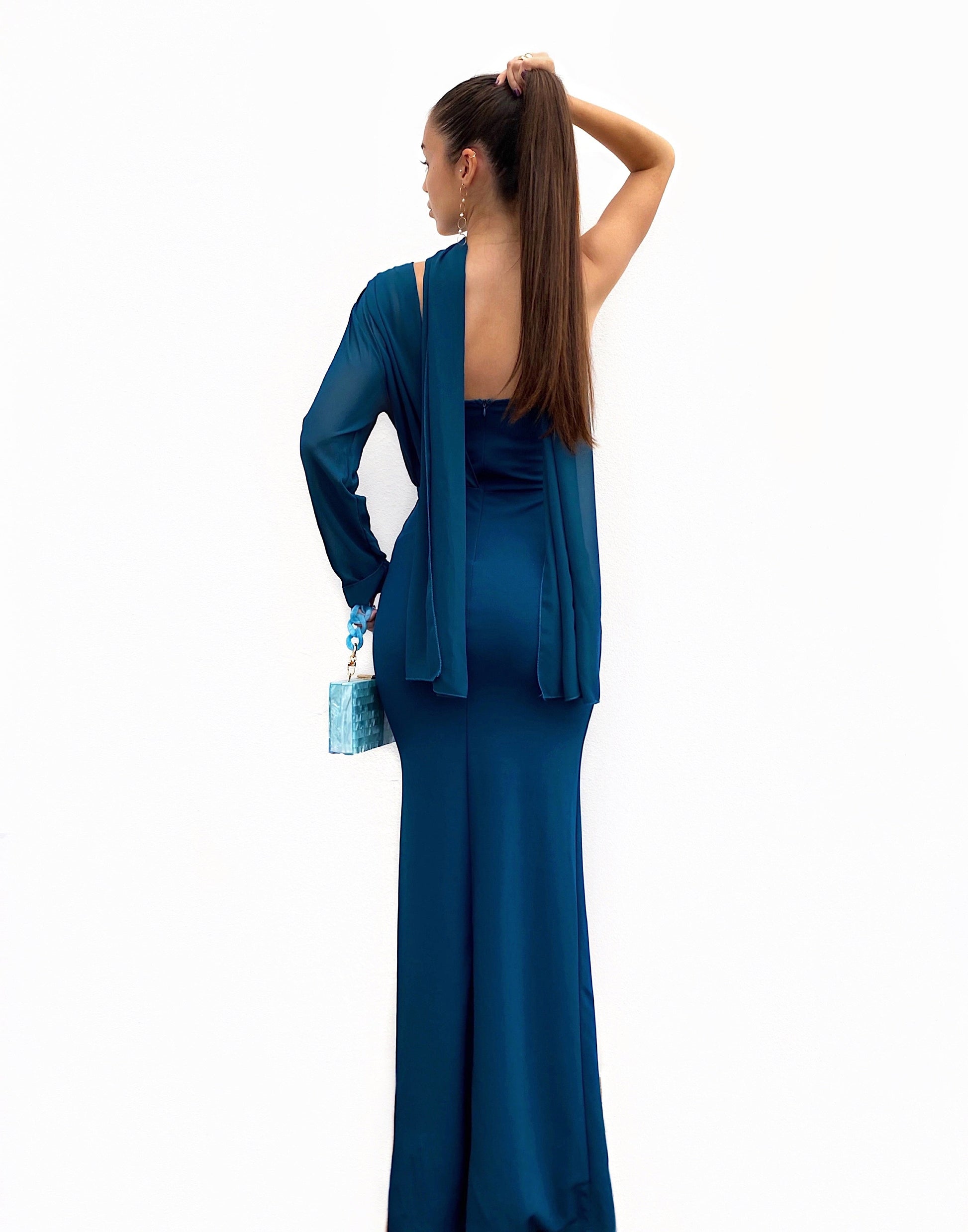 Vestido largo muy ajustado al cuerpo de color azul petróleo y de tejido scubacrepe. Lleva escote asimétrico y detalle de manga con tejido de gasa. Tiene abertura lateral en la pierna derecha y fular en el cuello. Cremallera trasera invisible. Es elástico, se adapta al cuerpo. Ideal para bodas, graduaciones, fiestas, eventos...