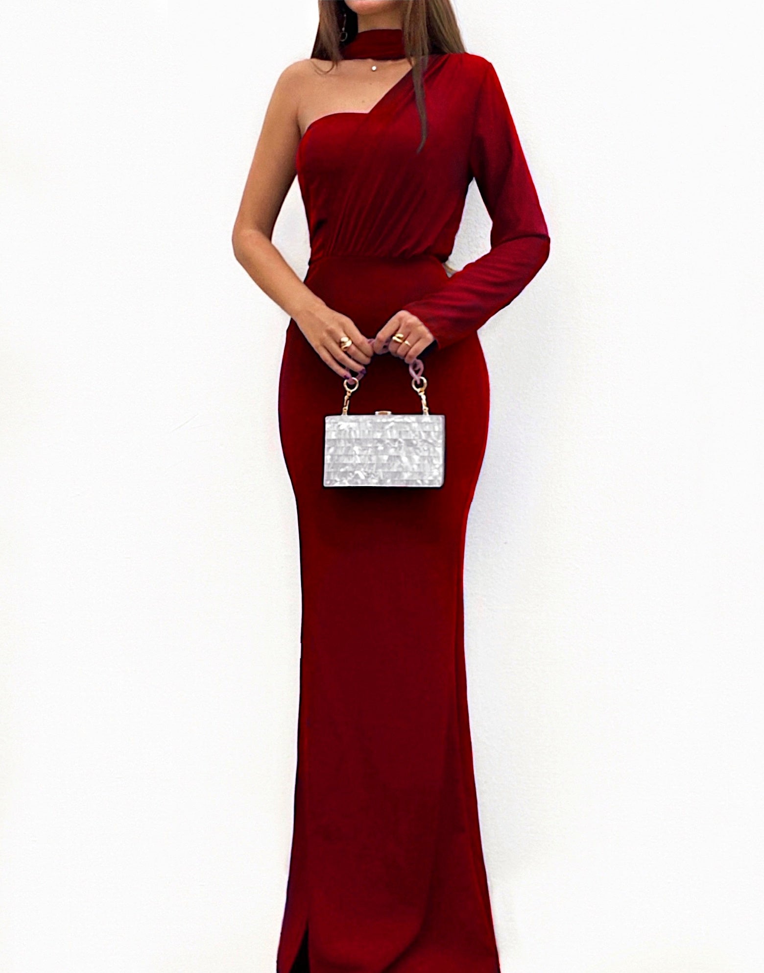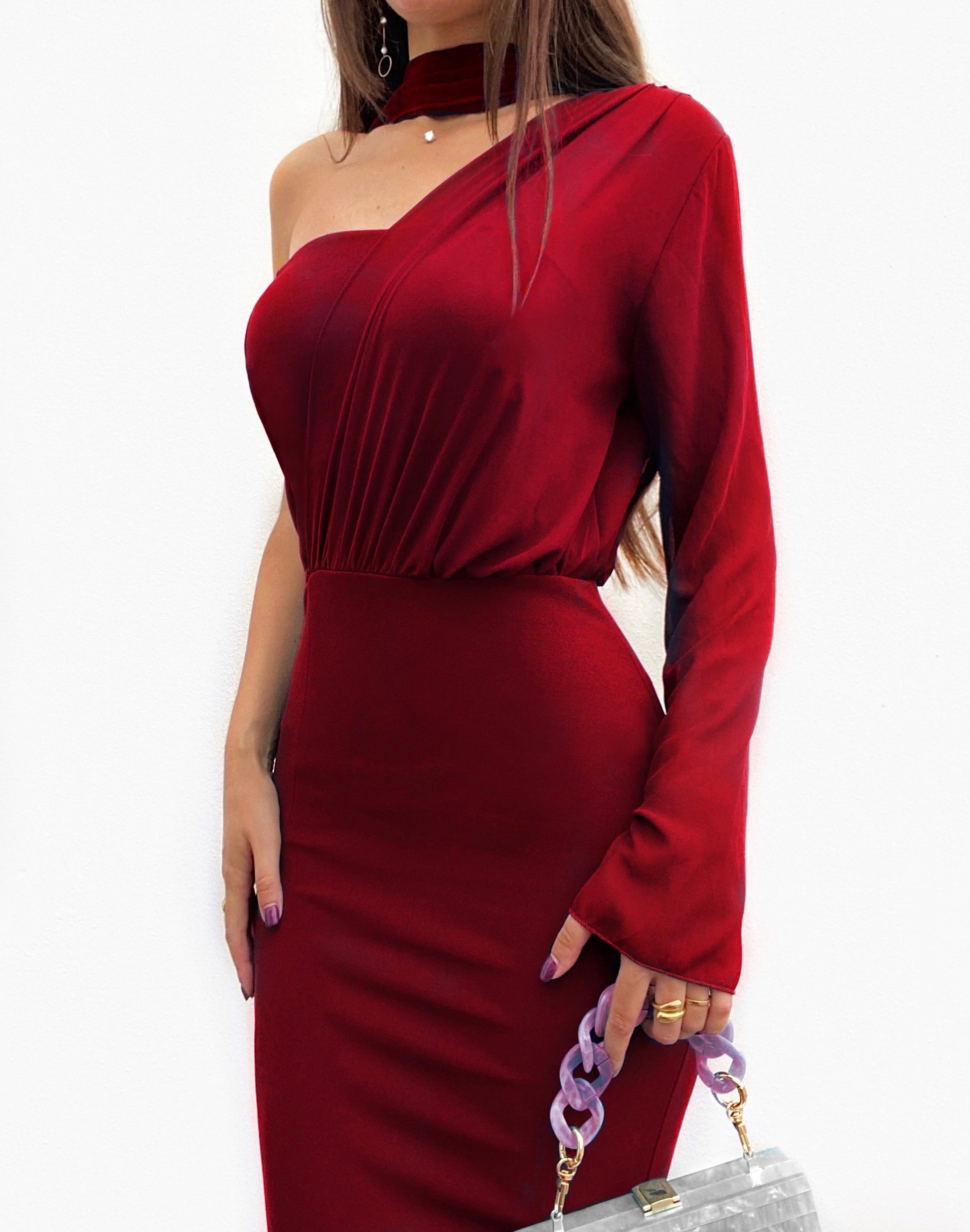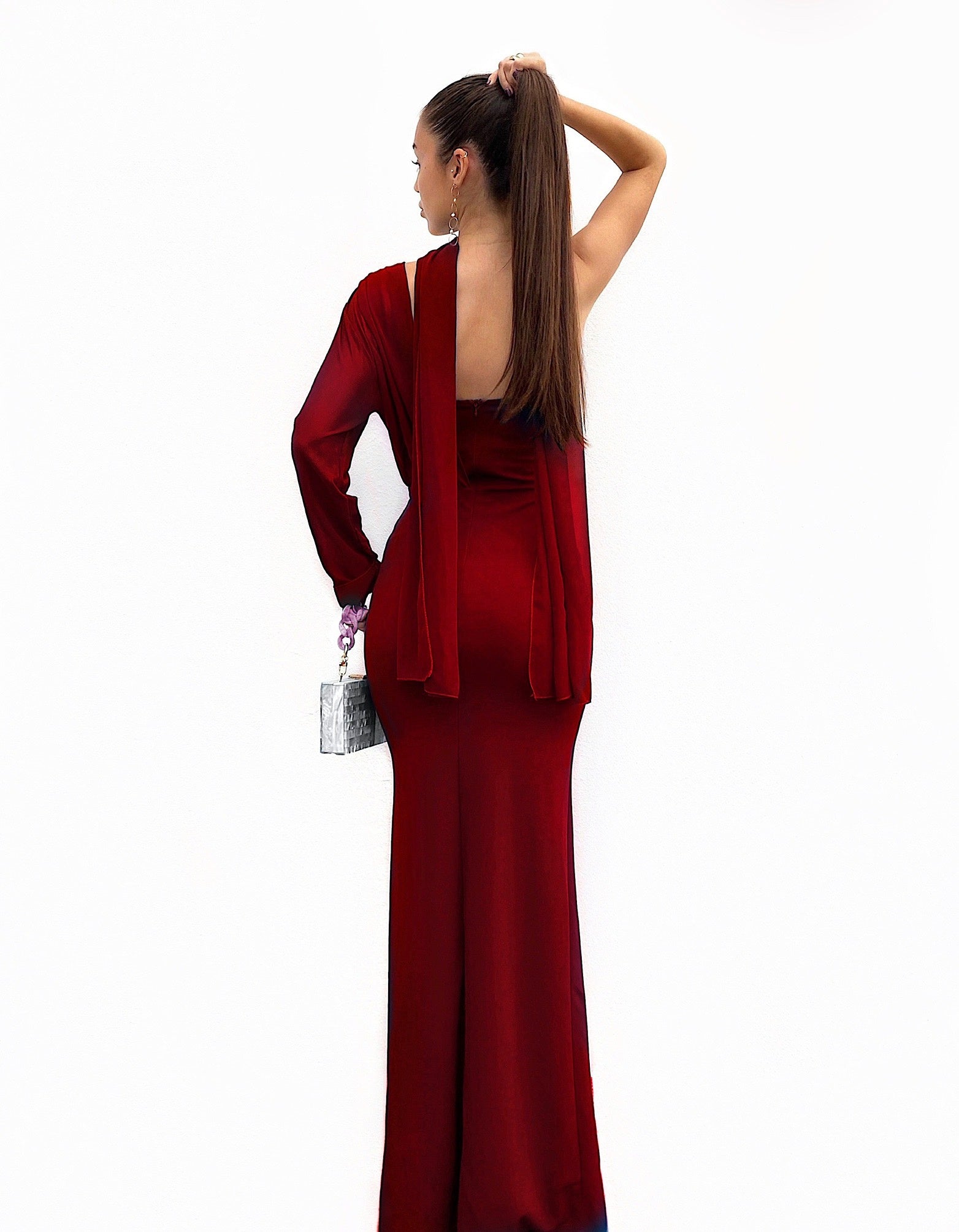 Vestido largo muy ajustado al cuerpo de color burdeos y de tejido scubacrepe. Lleva escote asimétrico y detalle de manga con tejido de gasa. Tiene abertura lateral en la pierna derecha y fular en el cuello. Cremallera trasera invisible. Es elástico, se adapta al cuerpo. Ideal para bodas, graduaciones, fiestas, eventos...