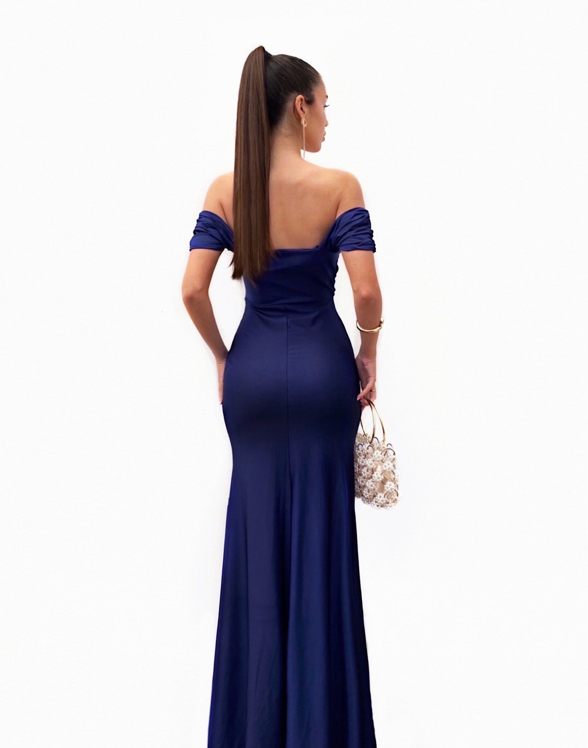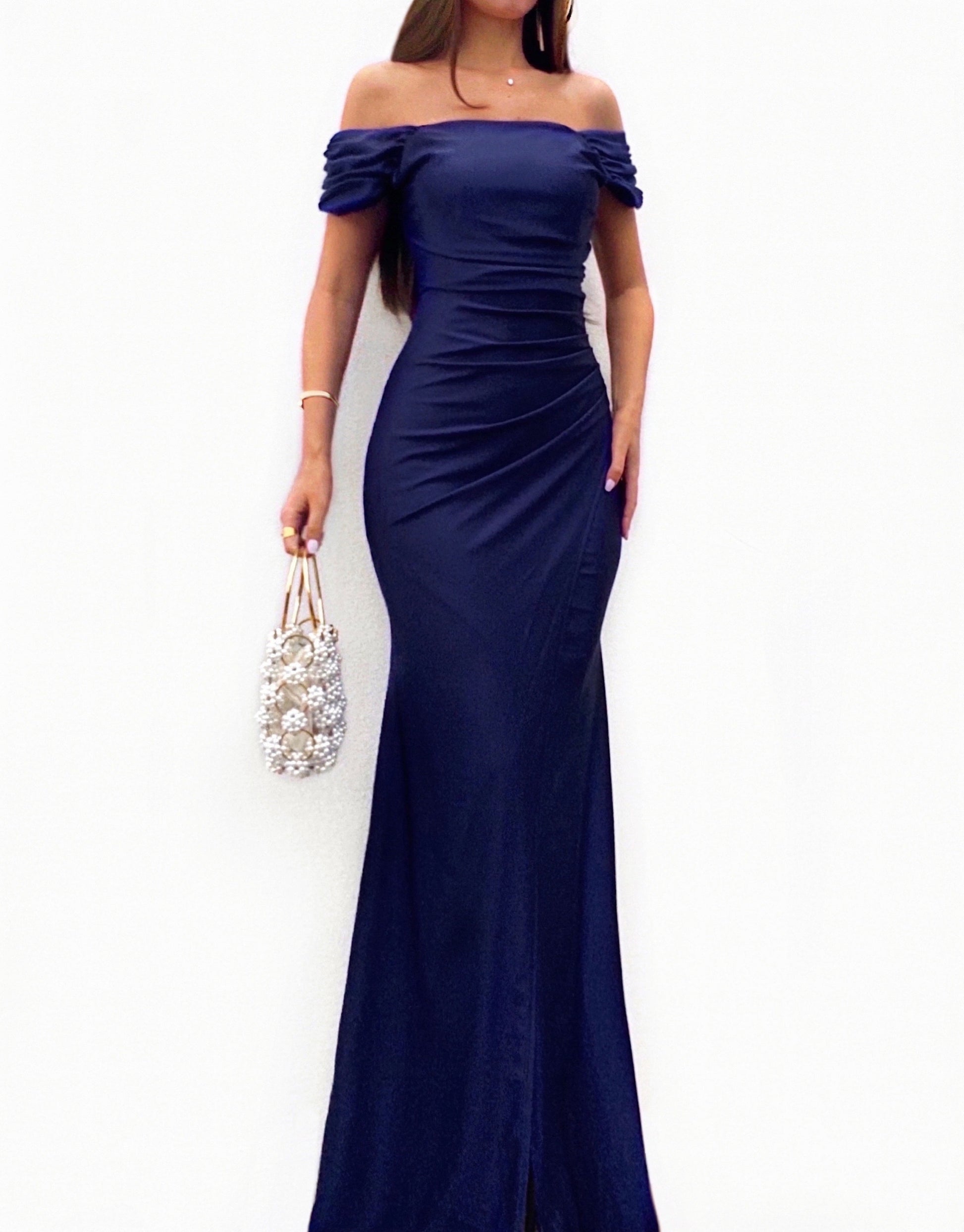 Vestido largo de tejido satinado y de color azul marino muy ajustado al cuerpo. Lleva corte sirena, detalle de manguitos y frunce, drapeado en el cuerpo, copas que se ajustan genial al pecho y abertura en la pierna en el lateral derecho. También tiene tirantes regulables que se pueden poner o meter por dentro, dependiendo de tu gusto. Es elástico. Ideal para graduaciones, bodas, eventos...