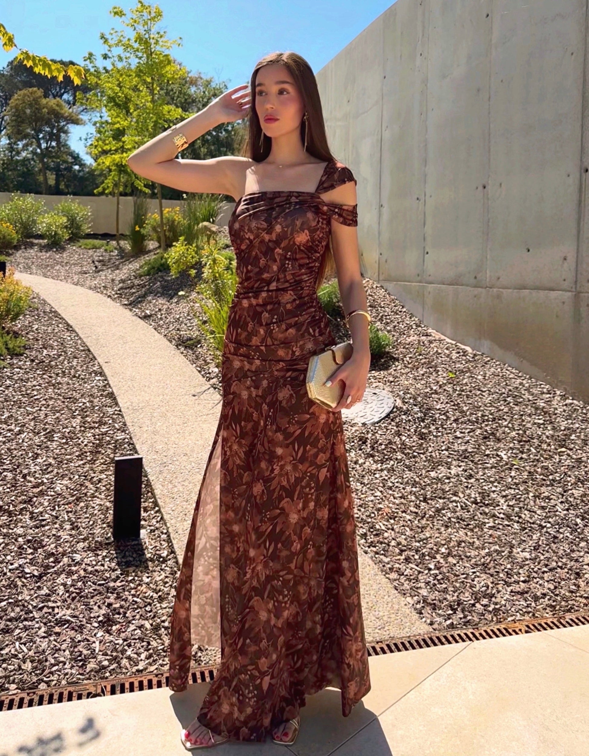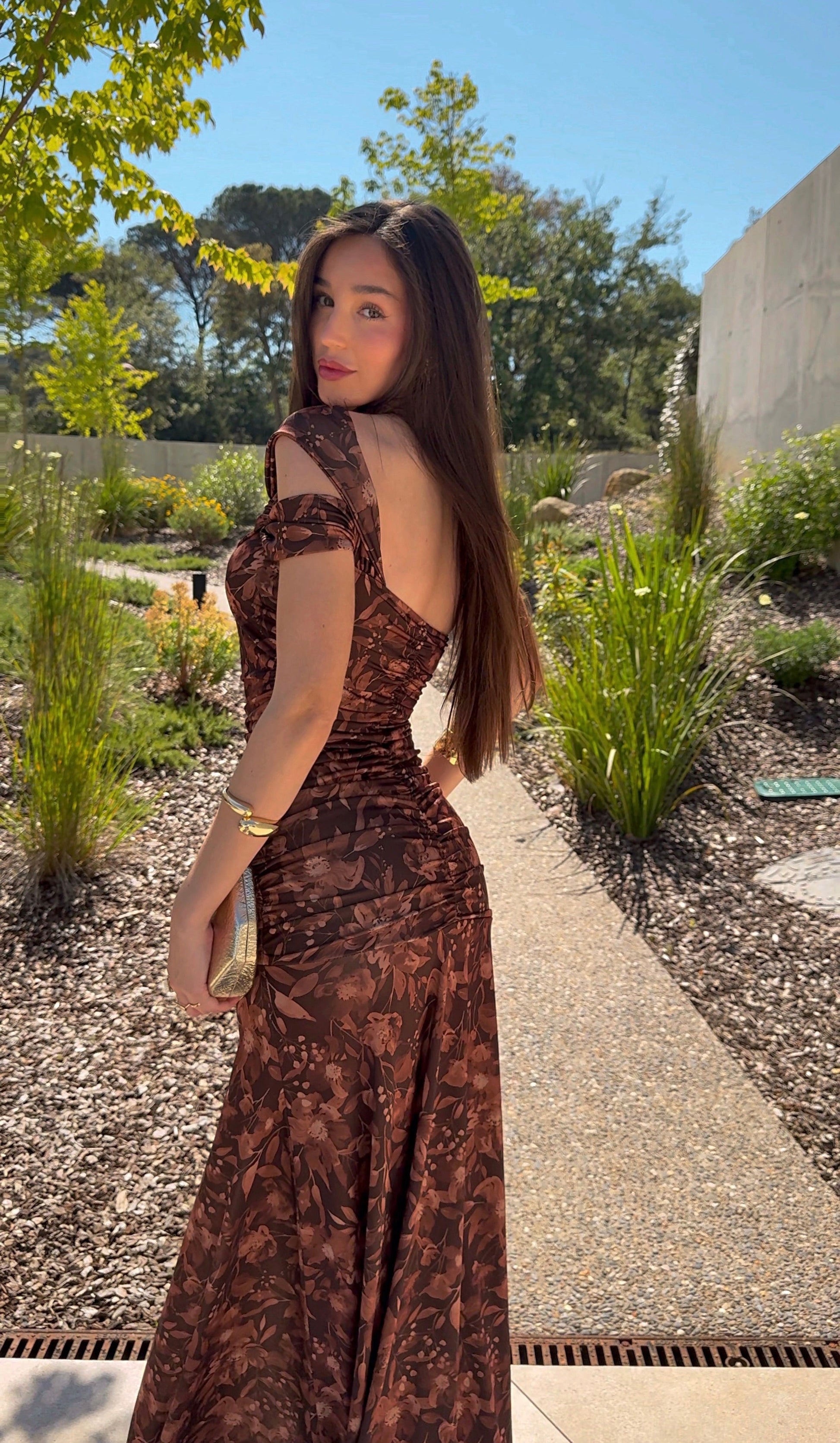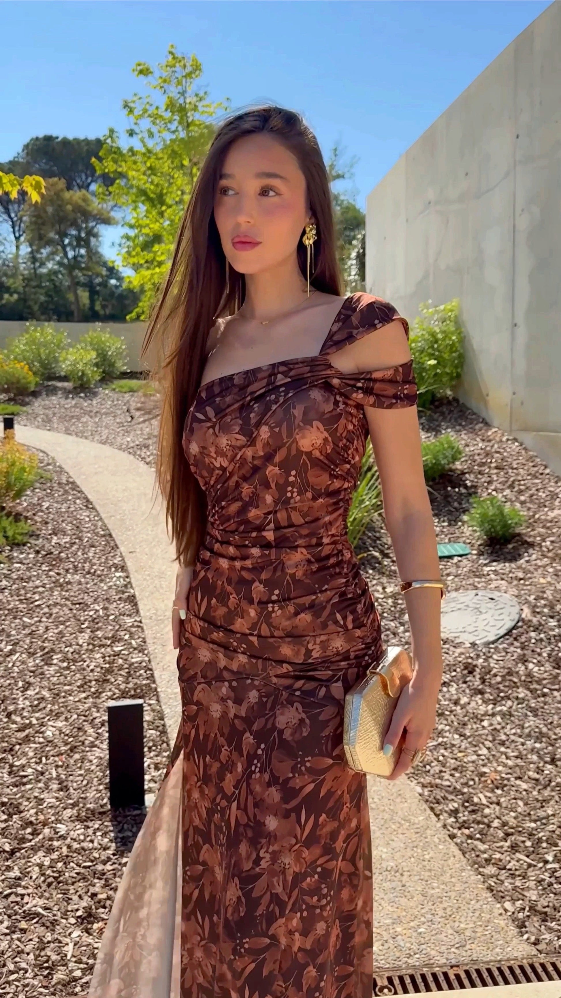 Vestido largo de color chocolate y de tejido licra con estampado de flores muy ajustado al cuerpo. Lleva escote barco asimétrico y drapeado en el cuerpo. Tiene copas y detalle de bandas que le da un toque muy favorecedor. Es elástico, se adapta genial al cuerpo. Ideal para eventos de verano, tardes y noches de cóctel, bodas, eventos...