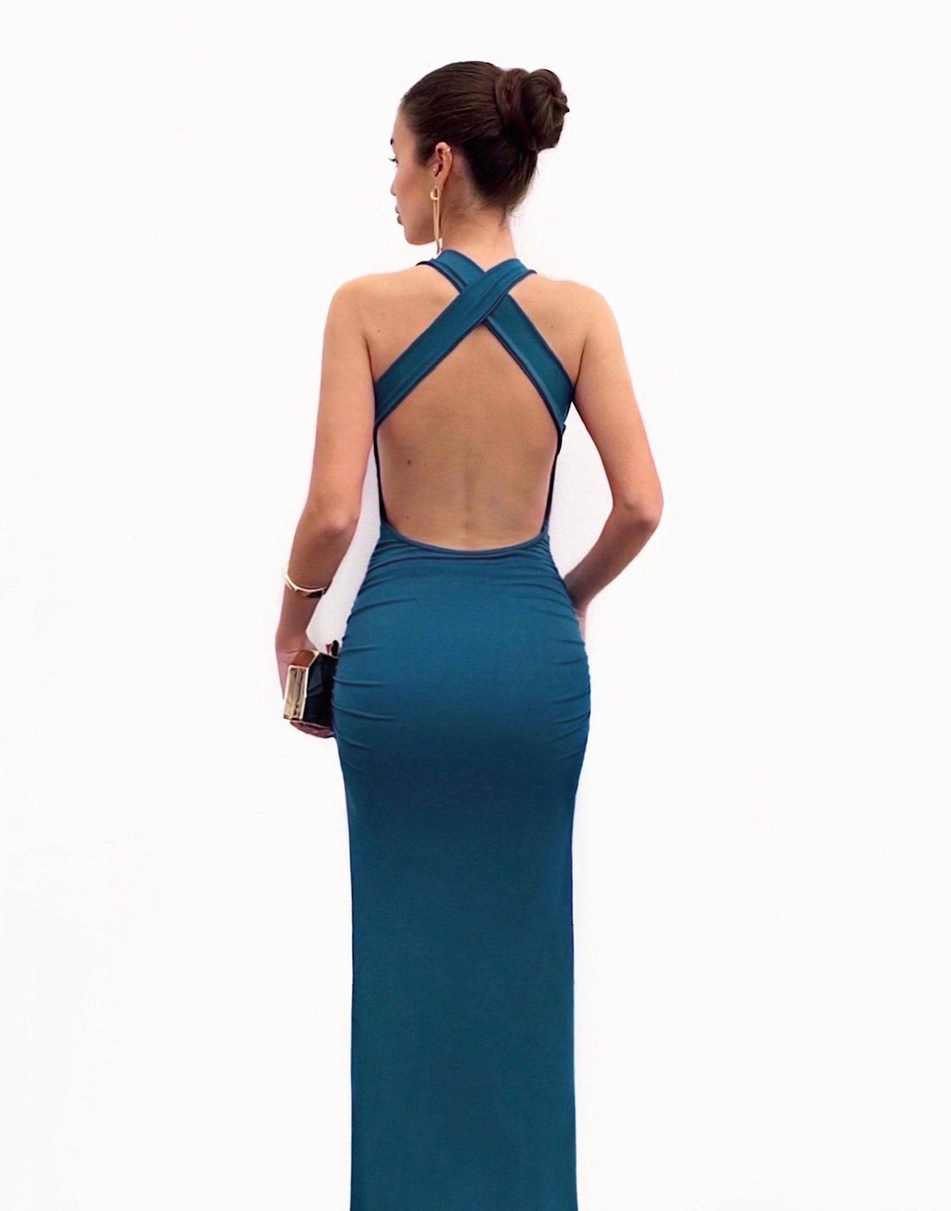 Vestido largo de tejido licra y de color azul petróleo muy ajustado al cuerpo. Lleva escote cascada con banda, frunce por todo el cuerpo y detalle de tirantes con hebillas doradas que le dan un toque muy elegante. La espalda es descubierta con tirantes cruzados. Es muy elástico. Ideal para graduaciones, bodas, eventos...