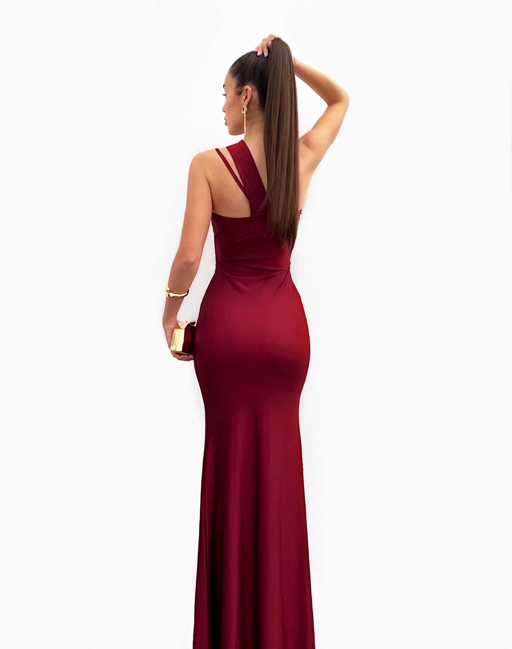 Vestido largo de tejido satinado y de color vino muy ajustado al cuerpo. Lleva escote en V con tirante cruzado y cuerpo fruncido para realzar la cintura. Tiene abertura en un lateral de la pierna. Es elástico. Ideal para graduaciones, bodas, eventos...