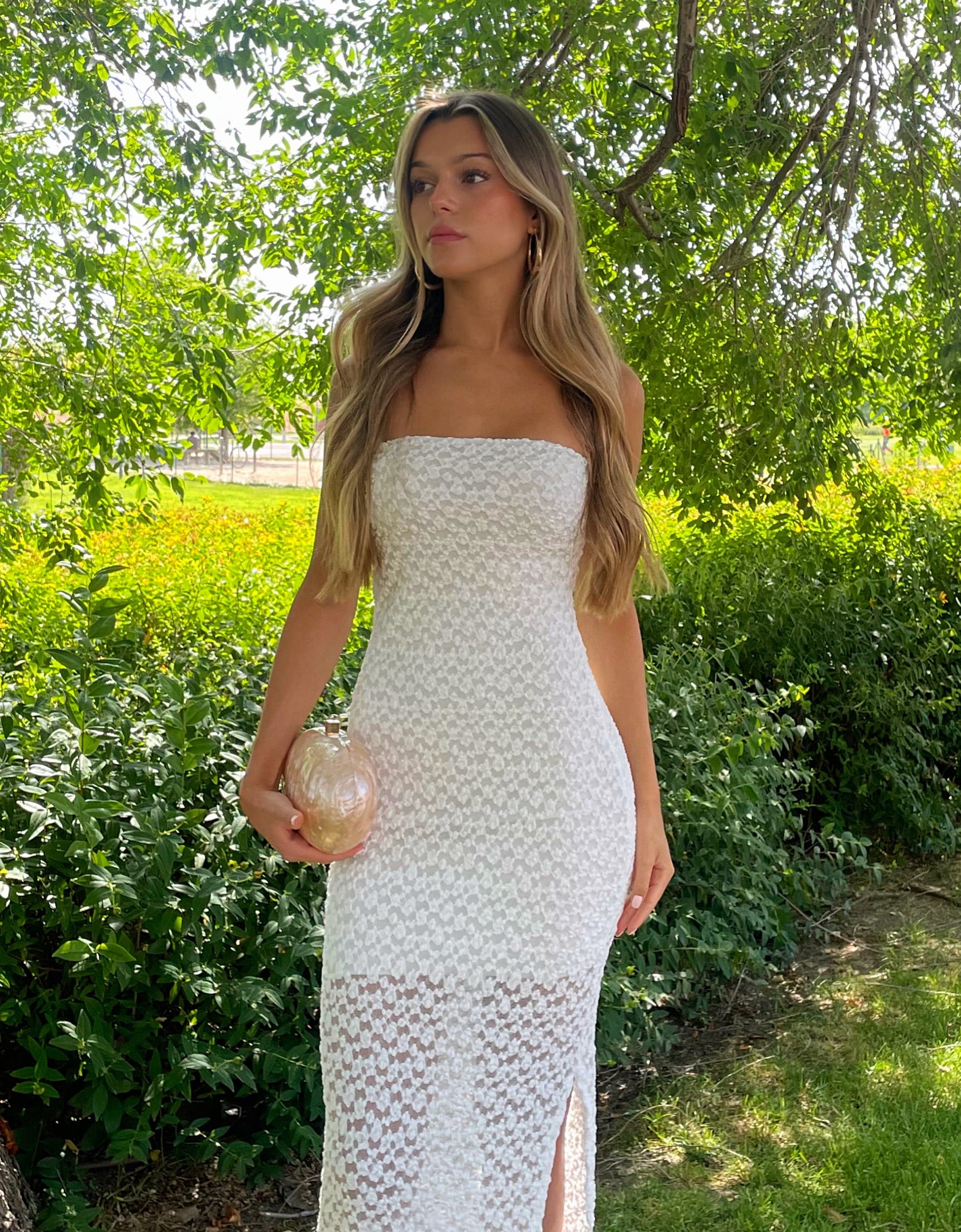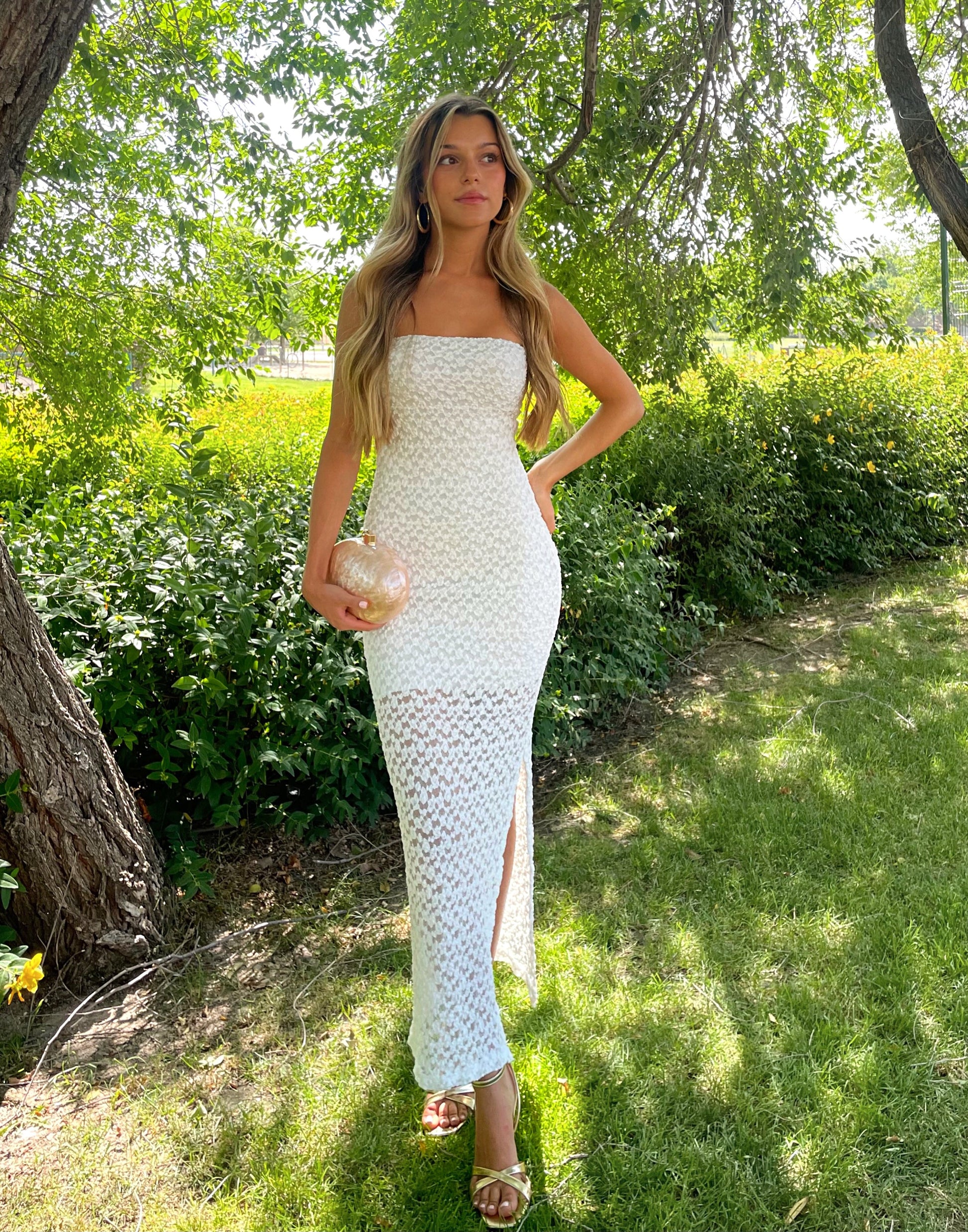 Vestido largo con tejido de encaje bordado de flores y de color blanco muy ajustado al cuerpo. Lleva escote palabra de honor, forro y abertura en un lateral del vestido. Ideal para días y noches de verano, fiestas, etc.