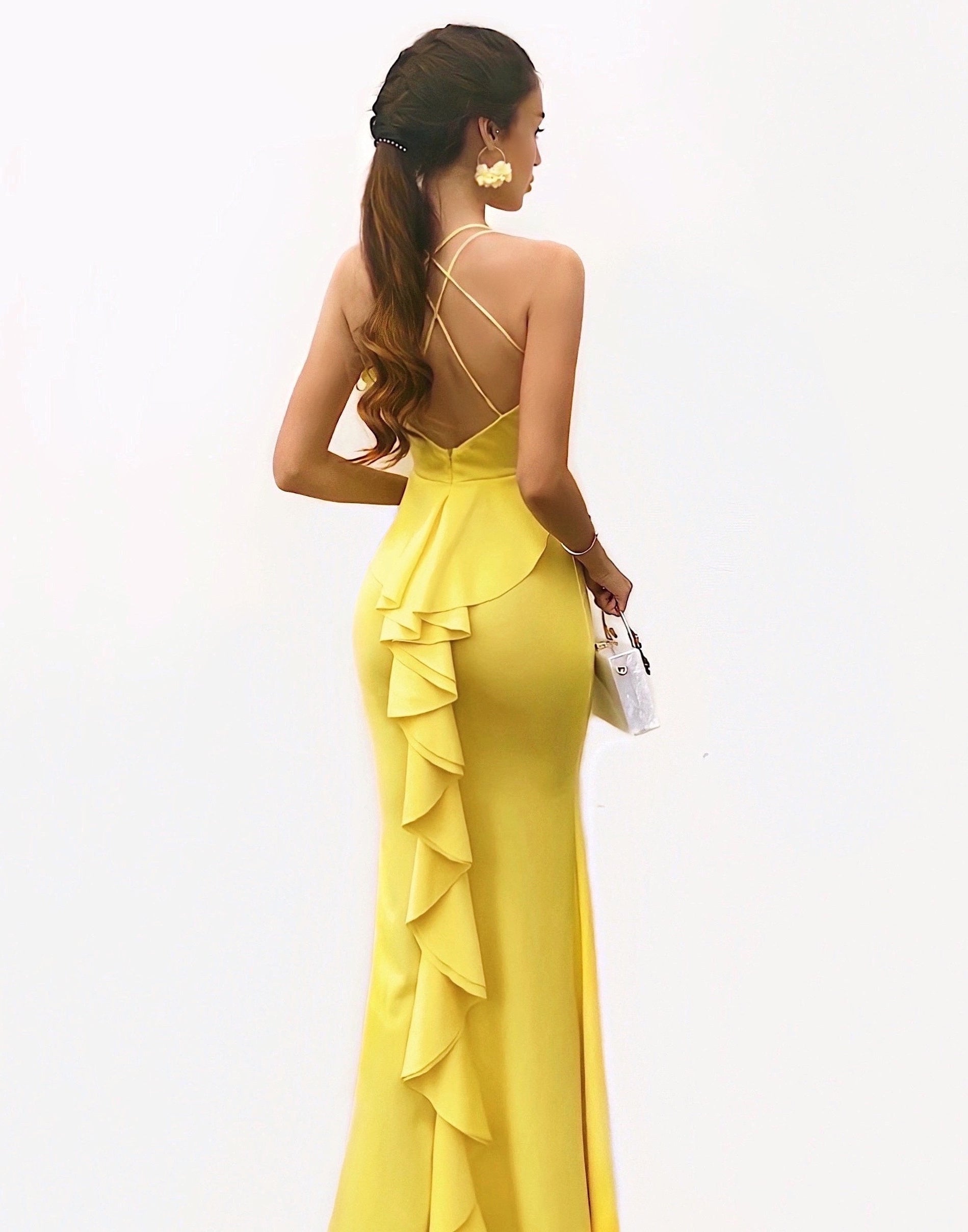 ¡Amor a primera vista con este vestido! Es largo, muy ajustado, elástico, realza todas las curvas del cuerpo. Lleva escote en forma de V, tirantes elásticos, corte en un lateral que deja entrever la pierna y una preciosa cola de sirena con detalle de lazo y volantes. Además la espalda es brutal, es descubierta, lleva tirantes cruzados y cremallera invisible. El vestido lleva copas que se adaptan genial al pecho. Ideal para graduaciones, bodas, eventos...