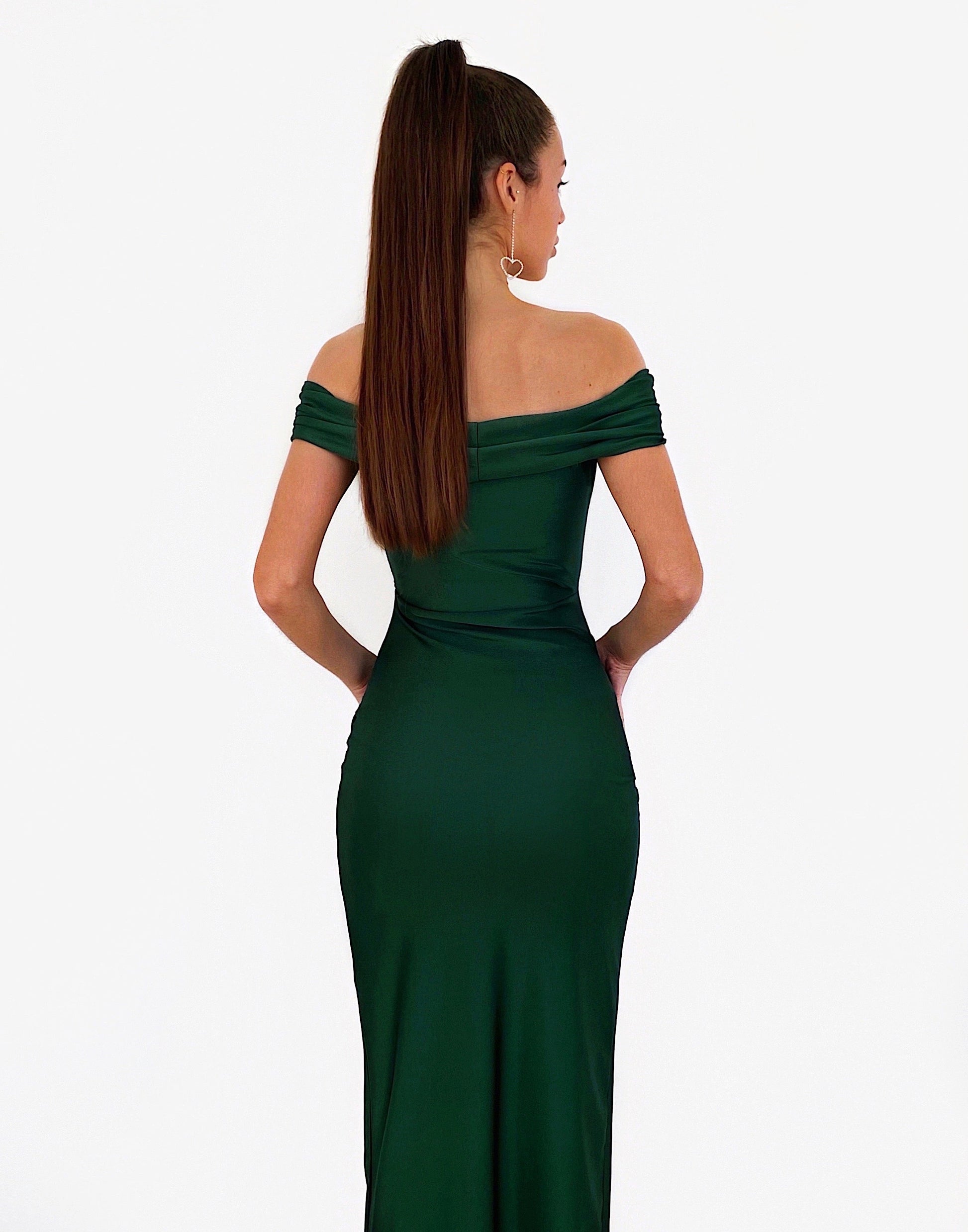 ¡Precioso vestido de nueva colección! Es largo de tejido satinado y de color verde muy ajustado al cuerpo. Lleva escote barco, frunce en la falda y abertura lateral. Es muy elástico. Ideal para graduaciones, eventos, bodas, aniversarios...