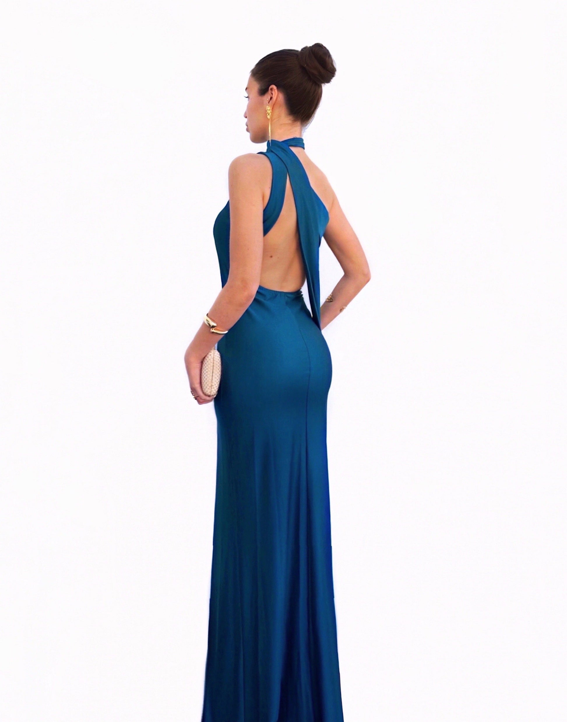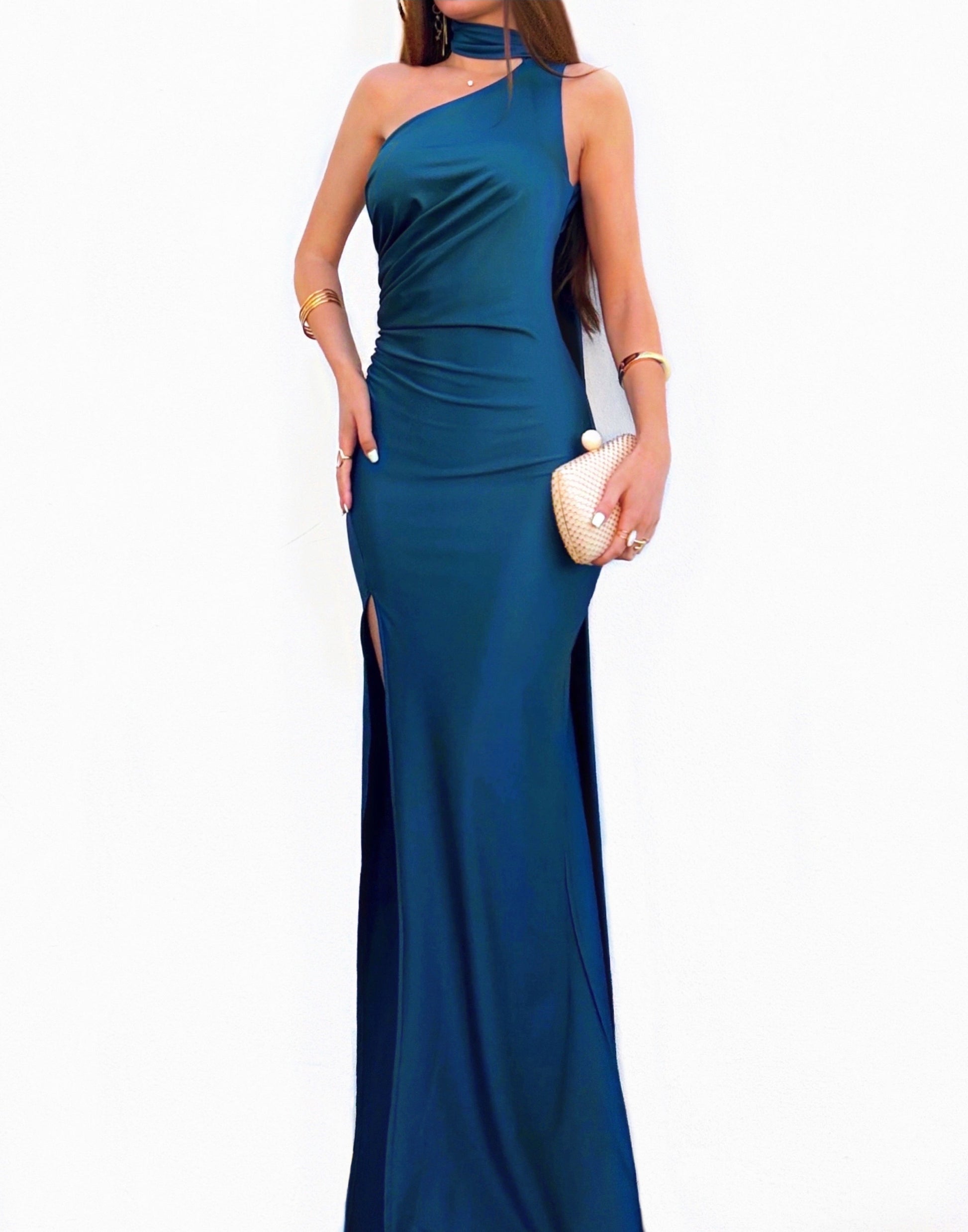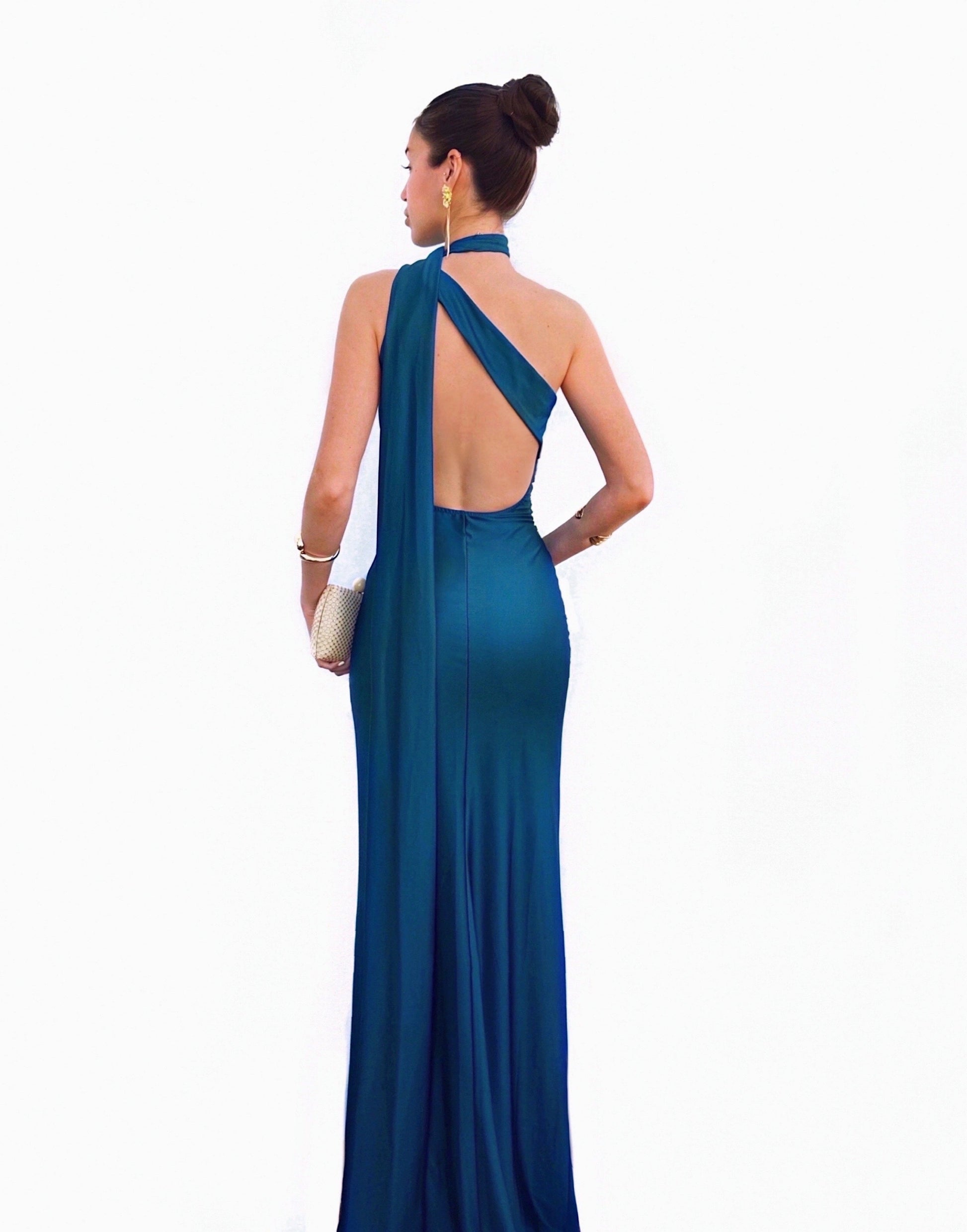 Vestido largo de color azul petróleo y de tejido satinado muy ajustado al cuerpo. Lleva escote asimétrico, capa larga muy elegante anudada al cuello y espalda descubierta. Tiene copas en el pecho, abertura en un lateral de la pierna y frunce en un lado del cuerpo. Es elástico. Ideal para graduaciones, bodas, eventos....