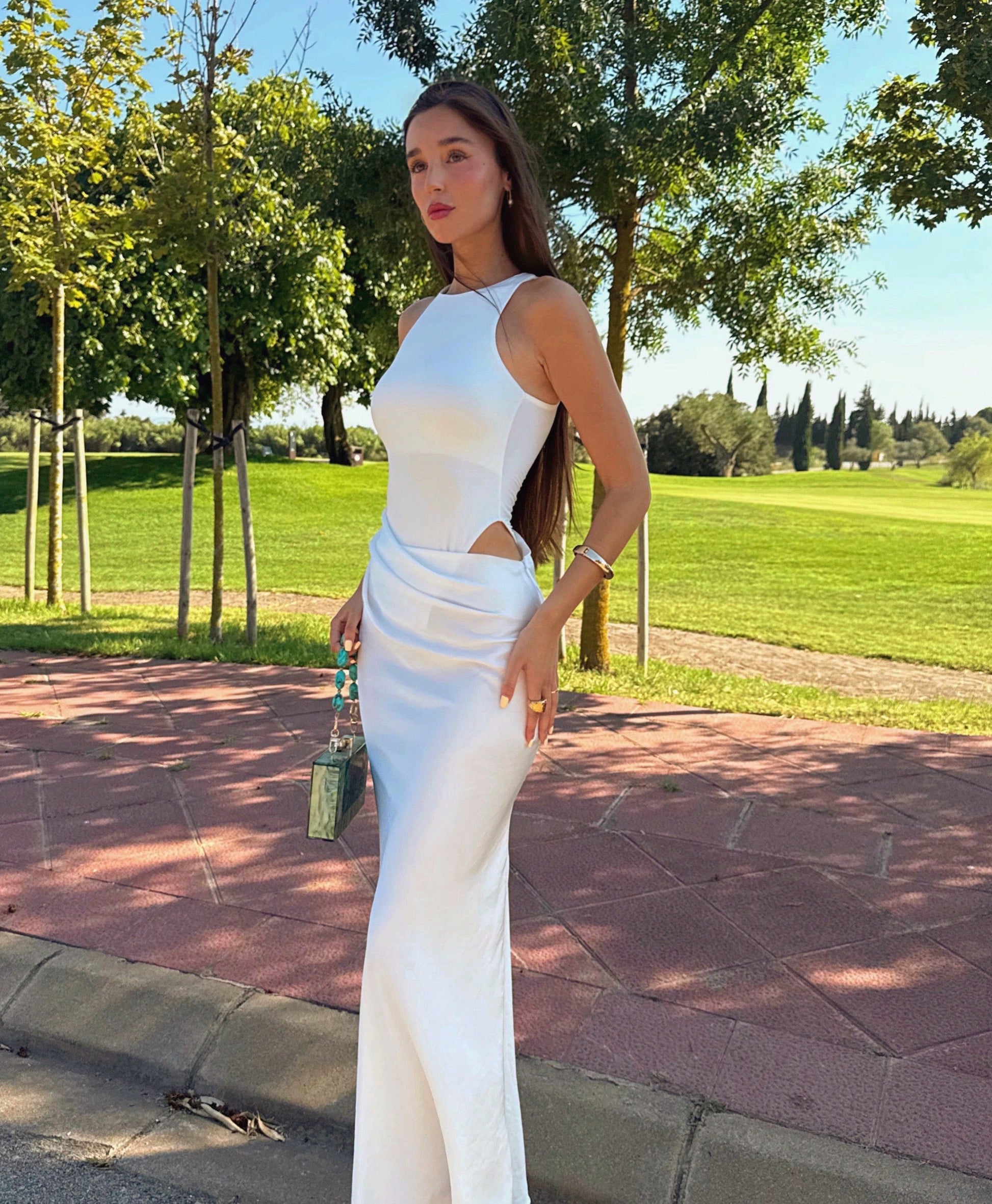 Vestido largo de tejido licra y raso muy ajustado al cuerpo. Lleva body con forro, cuello redondo sin mangas y falda satinada con frunce y vuelo. Tiene cremallera lateral. Ideal para días y noches de verano, fiestas, graduaciones, eventos...